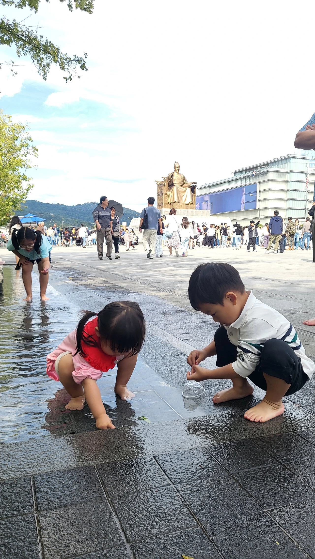 올해 마지막 연휴라 일컬어지는 한글날에 아이들을 데리고 광화문을 찾았습니다. 한글을 만드신 세종대왕님도 직접 만나 뵙고 광장에서 열리는 다양한 한글 관련 행사도 경험시켜 주기 위해서 말이죠. 그런데 사람이 생각보다 너무 많고 아직 우리 아이들이 이해하기 어려운 부분이 많아 발길을 돌리려던 찰나에 작은 도랑 같은 곳을 발견했습니다. 광화문광장이 일순간 계곡으로 변모하는 진풍경이 연출되었지만 아이들은 생각보다 꽤 오래 그리고 재미있게 놀았습니다. 연휴 전후로 어린이집을 다녀온 허니와 달콤이. 그들은 또 어떤 하루를 보내고 왔을까요?