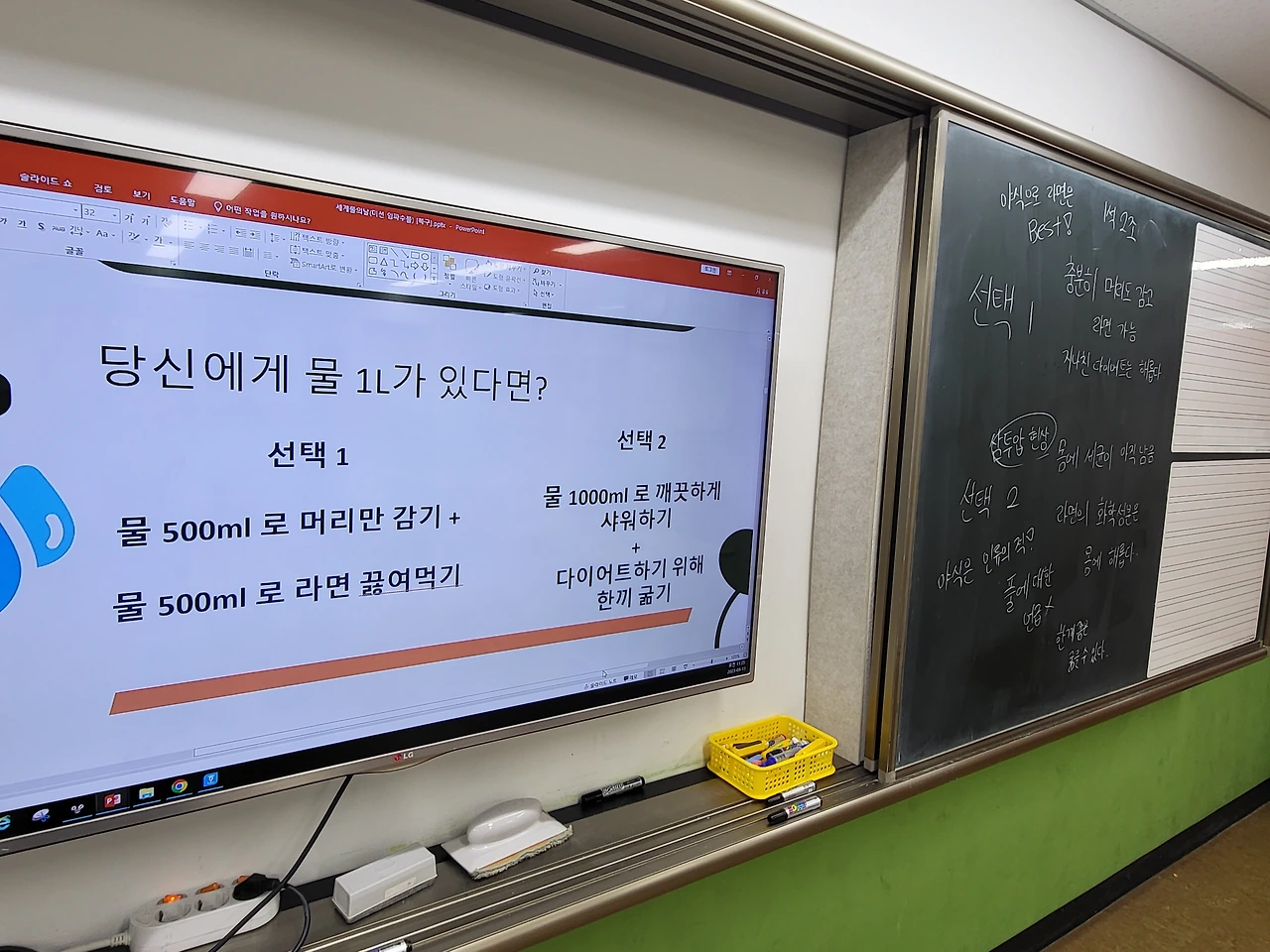이 수업은 학생들에게 다소 어려운 개념을 소개하는 것이기에 먼저 학생들에게 흥미를 유발할 수 있는 '밸런스 게임'을 도입하기로 했다. 주어진 주제는 '만약 여러분에게 물 1L가 있다면, 당신의 선택은 A인가 또는 B인가?'이다. 선택 A는 '물 500ml로 라면 끓여 먹기 + 물 500ml로 머리만 감기'이고 선택 B는 '물 1000ml로 샤워하기 + 한 끼 굶기'이다. 이 과정에서 중요한 기준이 하나가 있다. 바로 1대 1로 토론을 통해 상대방을 설득시키는 것이다. 이는 유대인들이 즐겨했던 '하브루타 양식'의 토의, 토론 방식을 차용했다. 학생들은 온전히 자신의 생각을 말로 자유롭게 표현하고 이를 통해 논리적으로 상대방을 설득하는 방법을 체득할 수 있다.