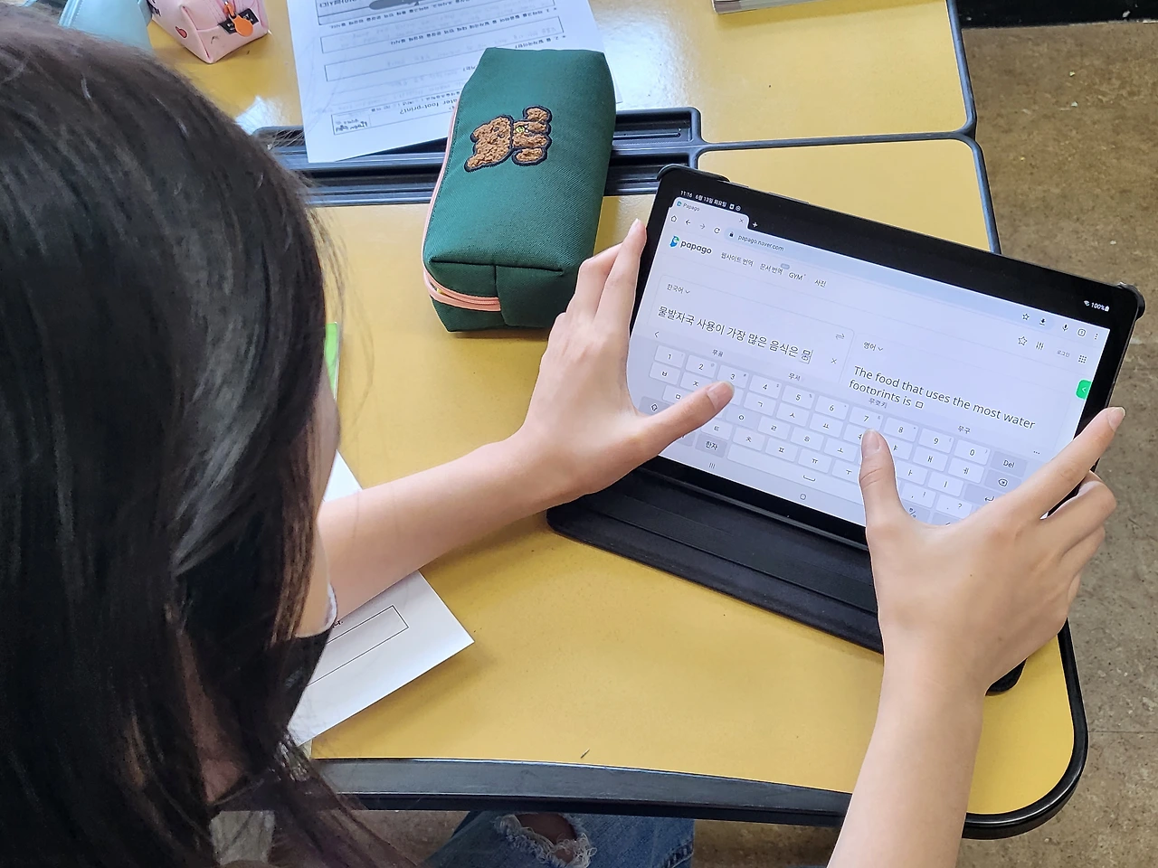 그런 다음 자연스럽게 물 발자국에 대한 소개로 수업을 진행한다. 그리고 우리가 평소에 물 발자국을 얼마나 활용하는지 알아보기 위해 음식마다 발생하는 물 발자국을 조사하게 한다. 코로나로 인해 바뀐 일상 중 하나는 학교에 태블릿 PC가 넘친다는 것. 학생들에게 1인 1 태블릿을 제공하고 마음껏 검색하고 찾아보게 한다. 그리고 파파고 번역기를 통해 오늘 배운 주제를 영어로 번역할 수 있는지 여부도 알아본다. 교사는 크게 손 볼 것이 없다. 방법만 알려주고 학생들에게 간간이 들려오는 질문만 답해주면 된다.