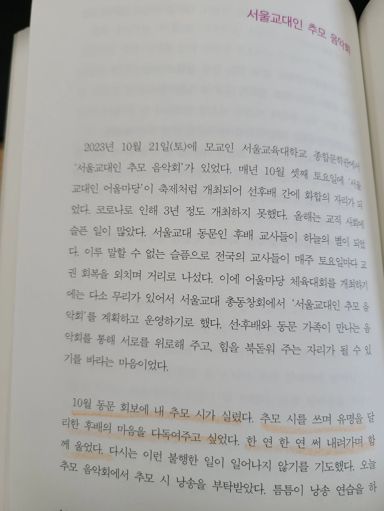 개인적으로 원대하게 갖고 있는 꿈이 하나가 '퇴직 후 여행. 단, 목적지가 제일 예쁘고 아름다울 때만 골라서'이다. 야속하게도 그런 명승지나 고적, 관광지는 일반적인 직장인이 한창 일을 하고 있을 4~6월 또는 9~11월일 때가 많다. 퇴직 이후 작가는 자신이 온전하게 가질 수 있게 된 일상 중 틈틈이 사랑하는 사람들과 함께 여행을 떠났다. 제일 부러운 순간이기도 하고 나도 저런 삶을 살아보고 싶다는 희망을 쏘아 올린 챕터라서 애착이 가는 부분이다. 값비싼 곳, 죽기 전에 꼭 바로 가봐야 하는 곳 등의 거창하거나 미사여구로 사탕발림된 장소는 하나도 없다. 그저 같이 가는 사람이 나에게 소중하기만 하면 그곳은 나에게 가장 특별한 여행장소로 기억되는 것이다. 그리고 대학교 대선배님으로서 후배들을 추모하는 곳에서 대표로 시를 낭송하여 주신 것도 교사 후배로서 기억이 많이 남는다. 9월 4일을 진정으로 아껴주고 자신의 일처럼 생각해 주신 관리자 출신 선배님을 만나기는 쉽지 않은 일이기 때문. 기회가 된다면 2024년 어울마당에서 직접 뵙고 인사를 드리고 싶은 생각이다.