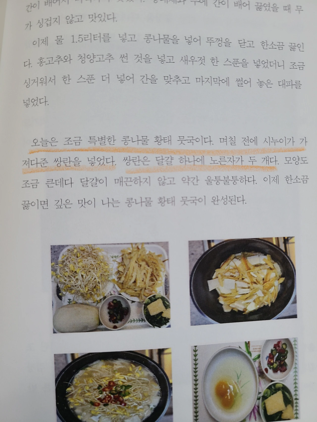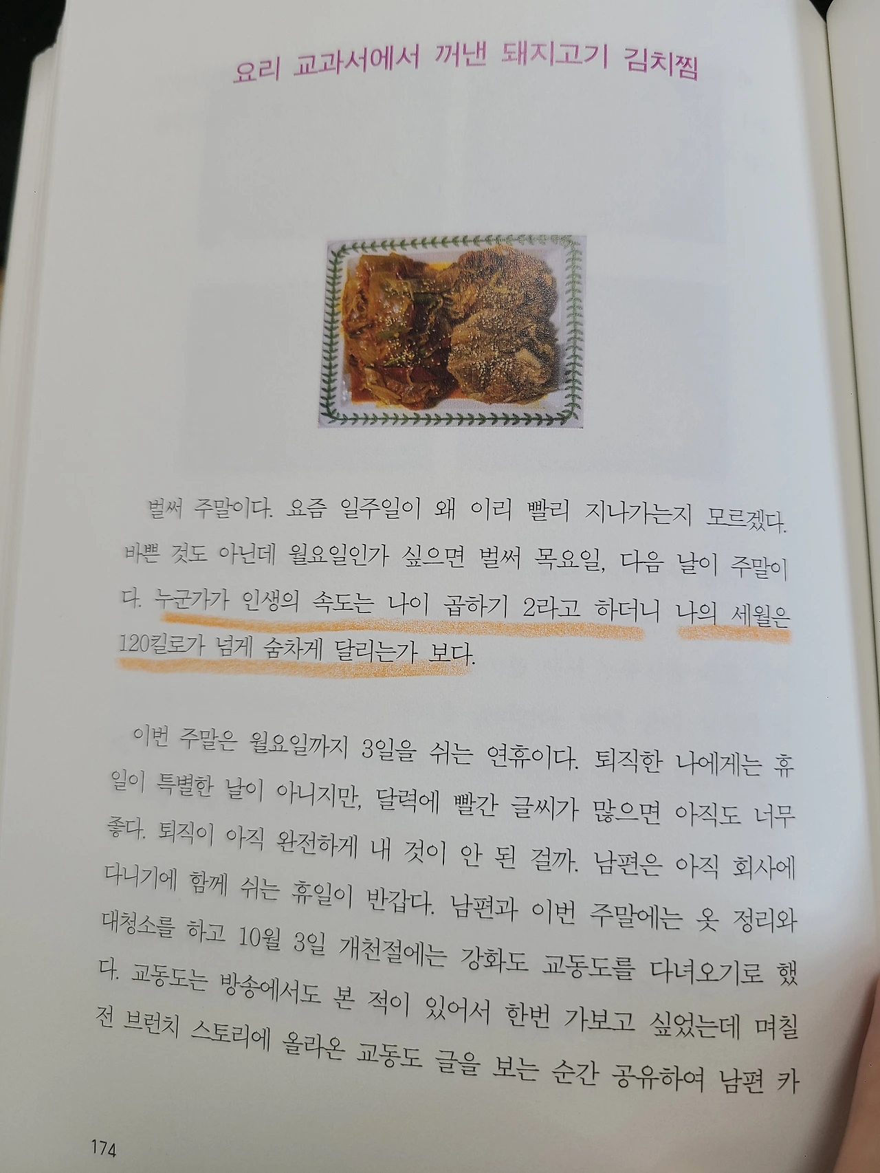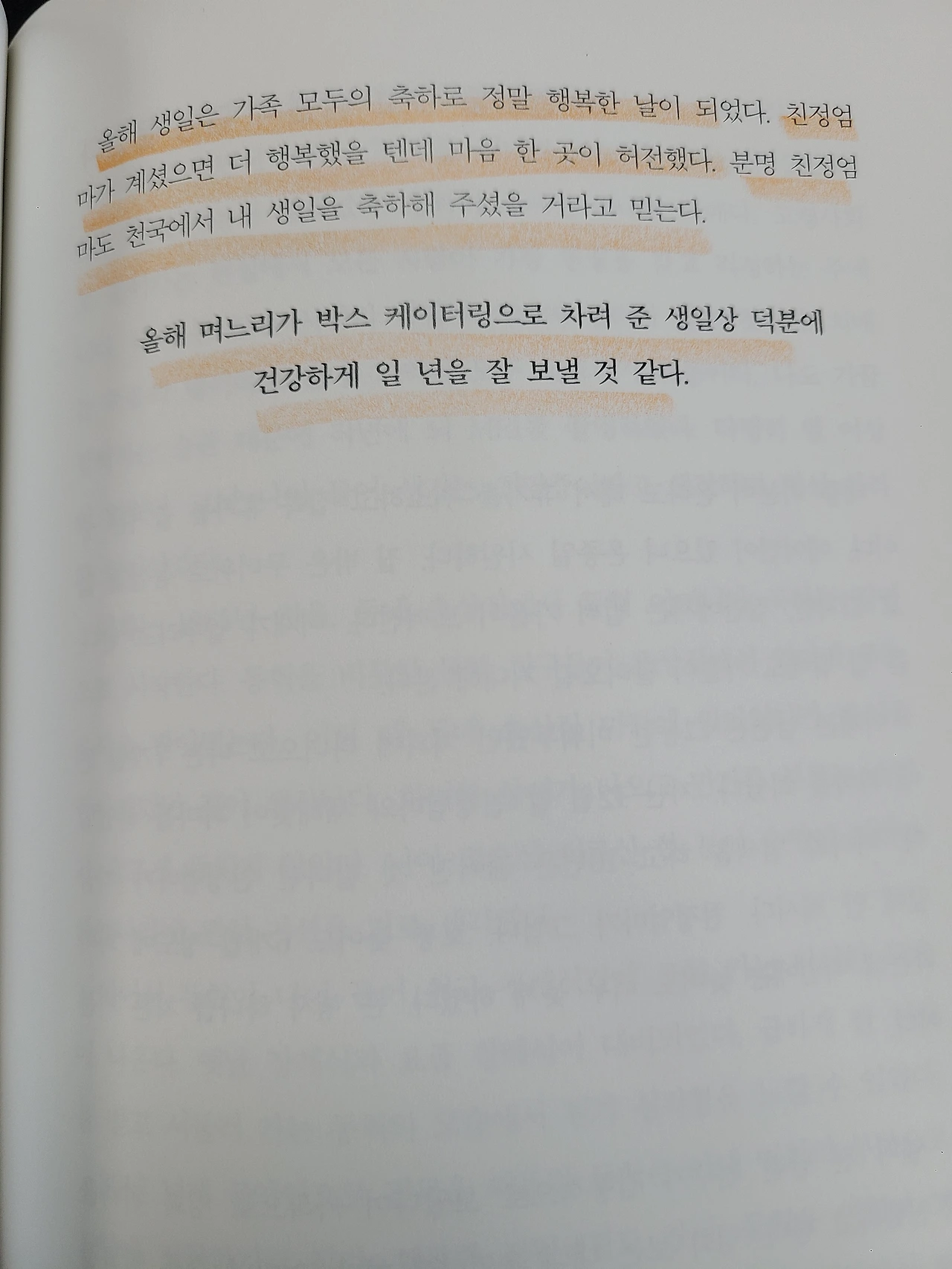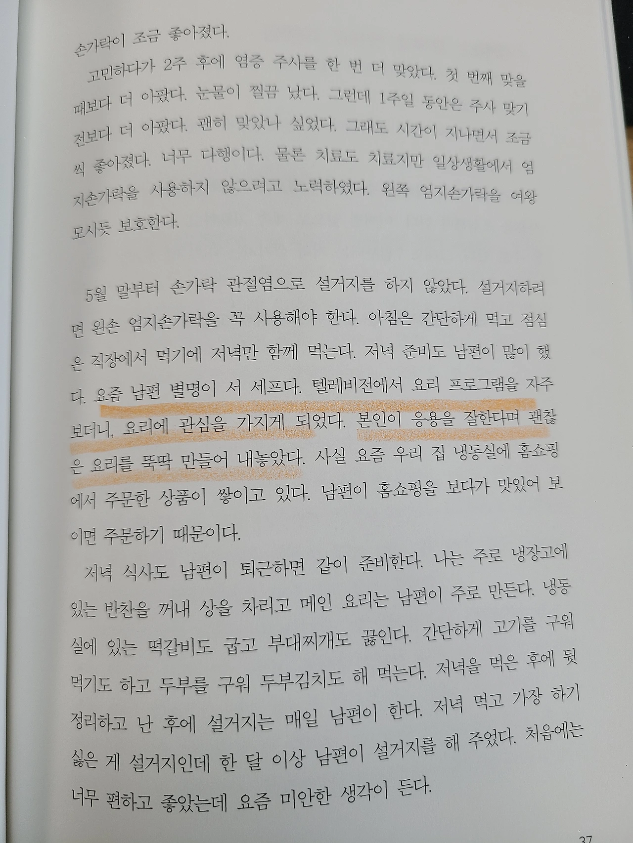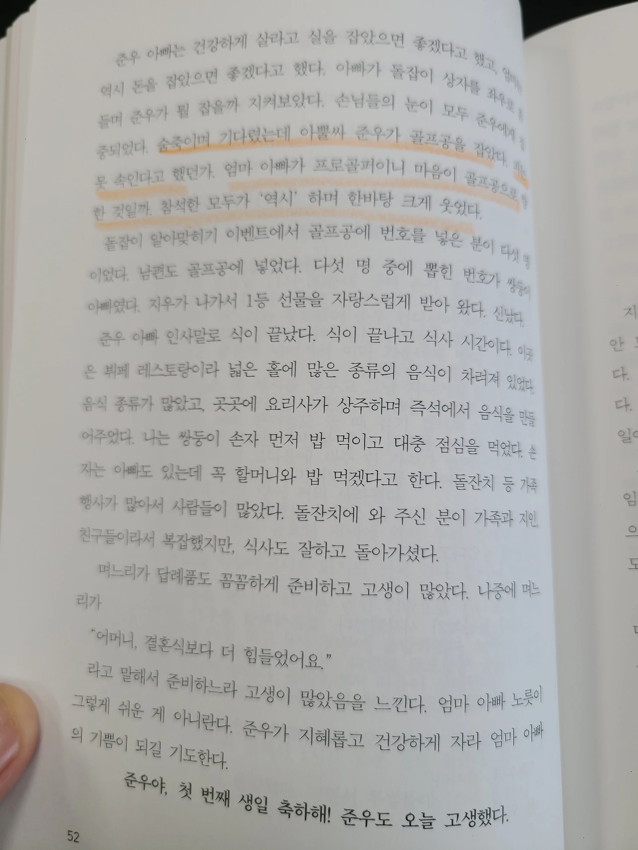 우선 글이 주는 간결함과 일대기적인 자연스러운 흐름이 편안하고 배우고 싶은 부분 중 하나이다. 글을 읽는 데 막힘이 없고 눈으로 보고 있는 것처럼 생생하다. 두 아이의 아빠의 시선으로 보면 작가의 손주들이 할머니와 함께 하는 모습이 선명하고 또렷하게 그려진다. 또한 남편으로서의 시선으로 사부님을 보면 서 셰프라는 직함을 새로이 하사 받아 하루라는 순간이 주는 설렘과 즐거움을 오롯이 받아들이는 남편의 모습이 그려진다. 두 아들 그리고 며느리, 손주 셋을 담은 챕터에서 엄마와 할머니의 사랑이 고스란히 드러난다. 가족의 탄생과 새로이 가족이 된 존재에 대한 넘쳐나는 사랑이 묻어난달까. 사랑스러운 남편이자 자상한 아빠가 되고 싶은 입장에서 많은 시사점과 교훈을 얻을 수 있었던 대목이다.