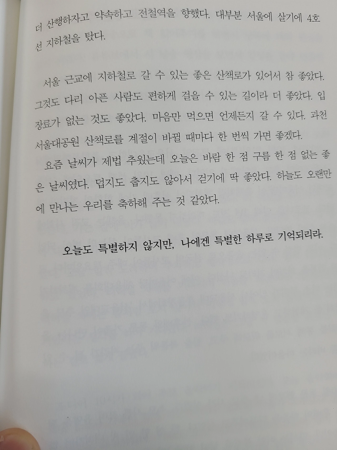 사람마다 조금씩 다르겠지만 우리는 모두 각자에게 주어진 하루를 살아간다. 눈을 뜨면 일어나고 배가 고프면 밥을 먹으며 목이 마르면 물을 마시고 졸리면 잠을 잔다. 매 순간 힘들지 않았을 순간이 어디 있겠냐마는 그마저도 지나고 보면 추억이 되는 것이 순리다. 그리고 이러한 이치를 깨달았을 때 우리는 한층 더 주어진 것에 감사할 줄 아는 여유가 생긴다. 작가님의 글을 보면 그런 만고의 진리가 온전히 느껴진다. 과거, 현재가 아닌 어딘가에 있을 '미래'를 마주하기 위해 작가는 하루하루를 평범하게 웃으며 살아간다.