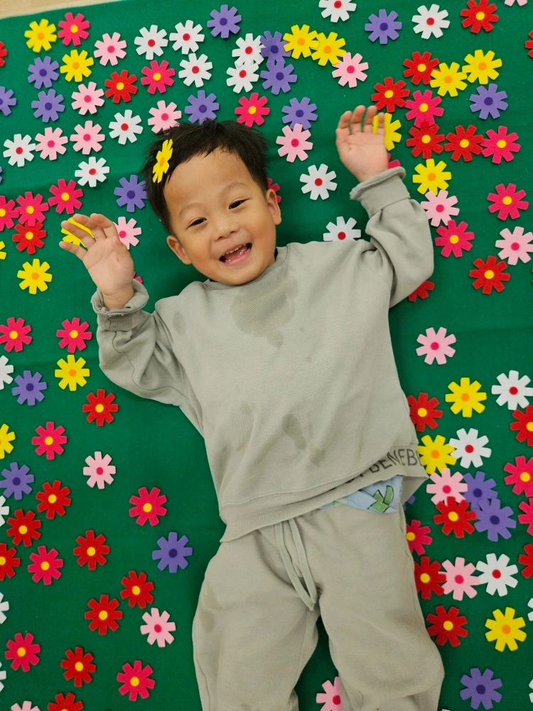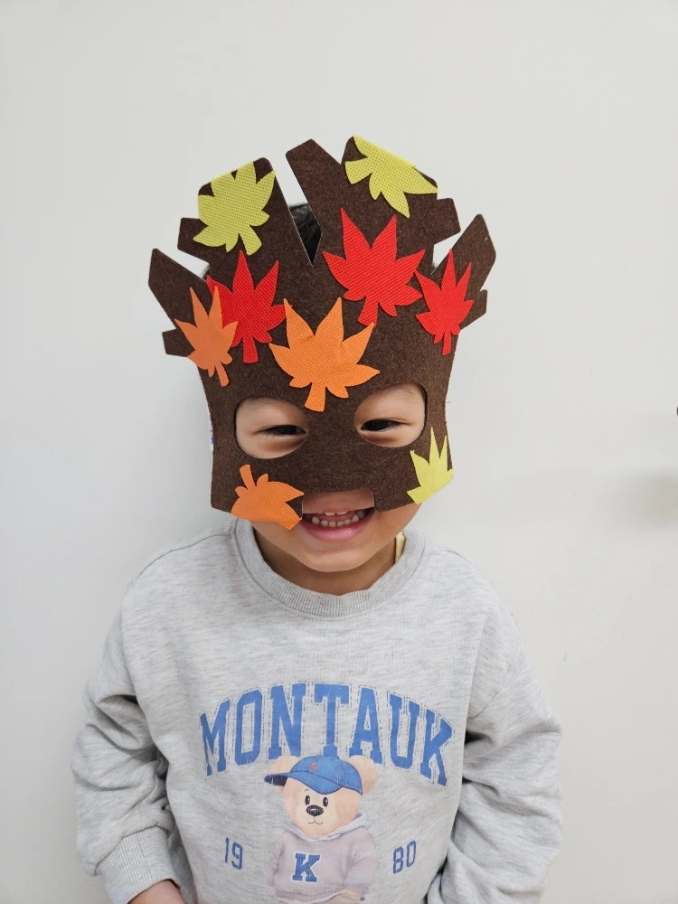 아들은 꿈같은 생일 주간을 뒤로한 채 맞이한 월요일 아침부터 대성통곡을 하였습니다. 어린이집에 가기 싫었기 때문이죠. 아마 저 같아도 싫었을 것입니다. 다행히 어린이집 선생님들께서 너른 마음으로 아들의 슬픔을 위로해 주셨습니다. 덕분에 아들은 닭똥 같은 눈물을 금세 그치고 '위드팡팡' 시간을 신나게 보냈습니다. 알록달록 예쁜 꽃 모양의 매트에서 뒹굴고 악기를 연주하며 가을 분위기를 오감으로 감상하는 수업을 들었네요. 또한 나만의 단풍잎 마스크 만들기 활동을 하며 친구들과 각자 만든 마스크에 대해 설명하는 활동도 전개하였습니다. 만 4세가 된 지 하루밖에 안 되었지만 아들의 공작실력이 향상되어 감을 느끼는 의미 있는 순간이었습니다.