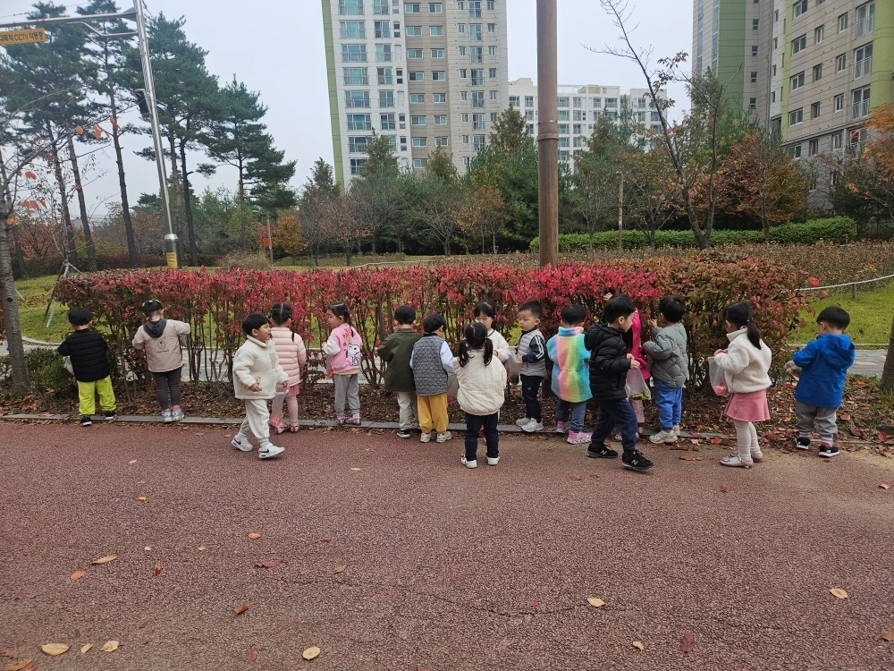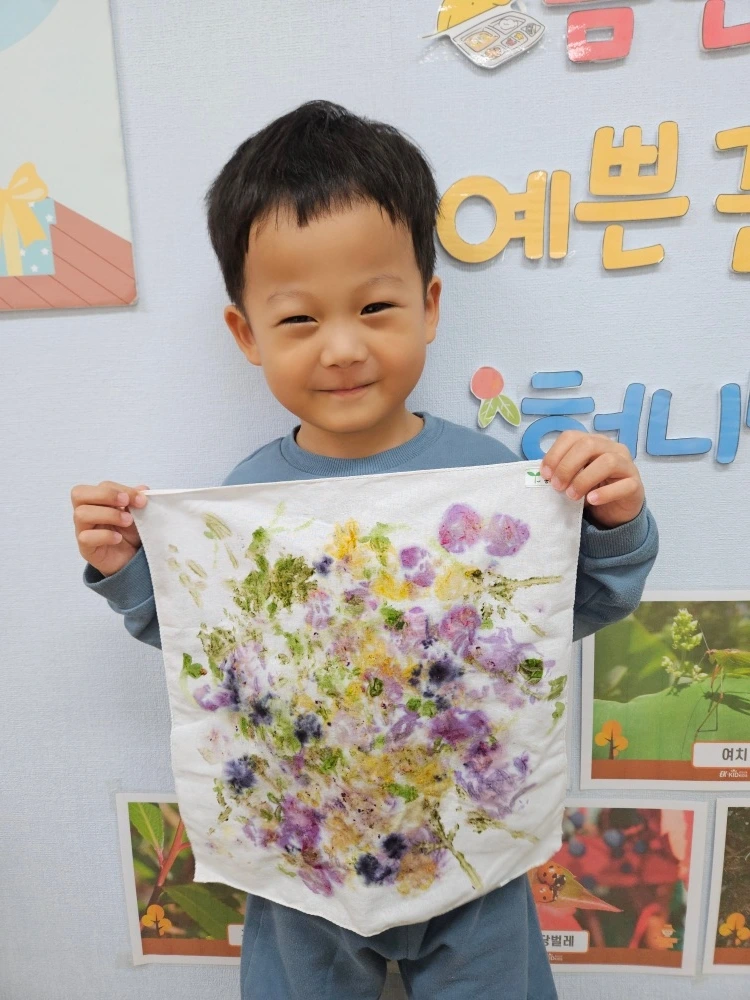 그리고 주중 마지막 날, 흐린 날씨임에도 불구하고 날씨가 그리 춥지 않아 어린이집 근처를 산책하며 형형색색의 나뭇잎과 꽃을 채집하는 활동을 하였습니다. 자기가 마음에 드는 나뭇잎과 땅에 떨어진 꽃잎을 주워 한지 위에 깔고 망치로 눌러 색을 물들이는 수업을 들었네요. 어린이집에서 마무리 한 작품을 놀이터에 가지고 와서 엄마아빠에게 큰 소리로 자랑하는 모습이 인상적이었습니다. 그것도 모자라 하원 직후에 가방에서 덤으로 받은 한지를 또 꺼내어 나뭇잎과 꽃을 물들여 복습하는 모습까지 선보인 허니였습니다. 넘쳐나는 학구열은 비록 10분 만에 사라졌지만 그 자체로도 충분히 멋졌기에 마음껏 칭찬해 주었습니다.