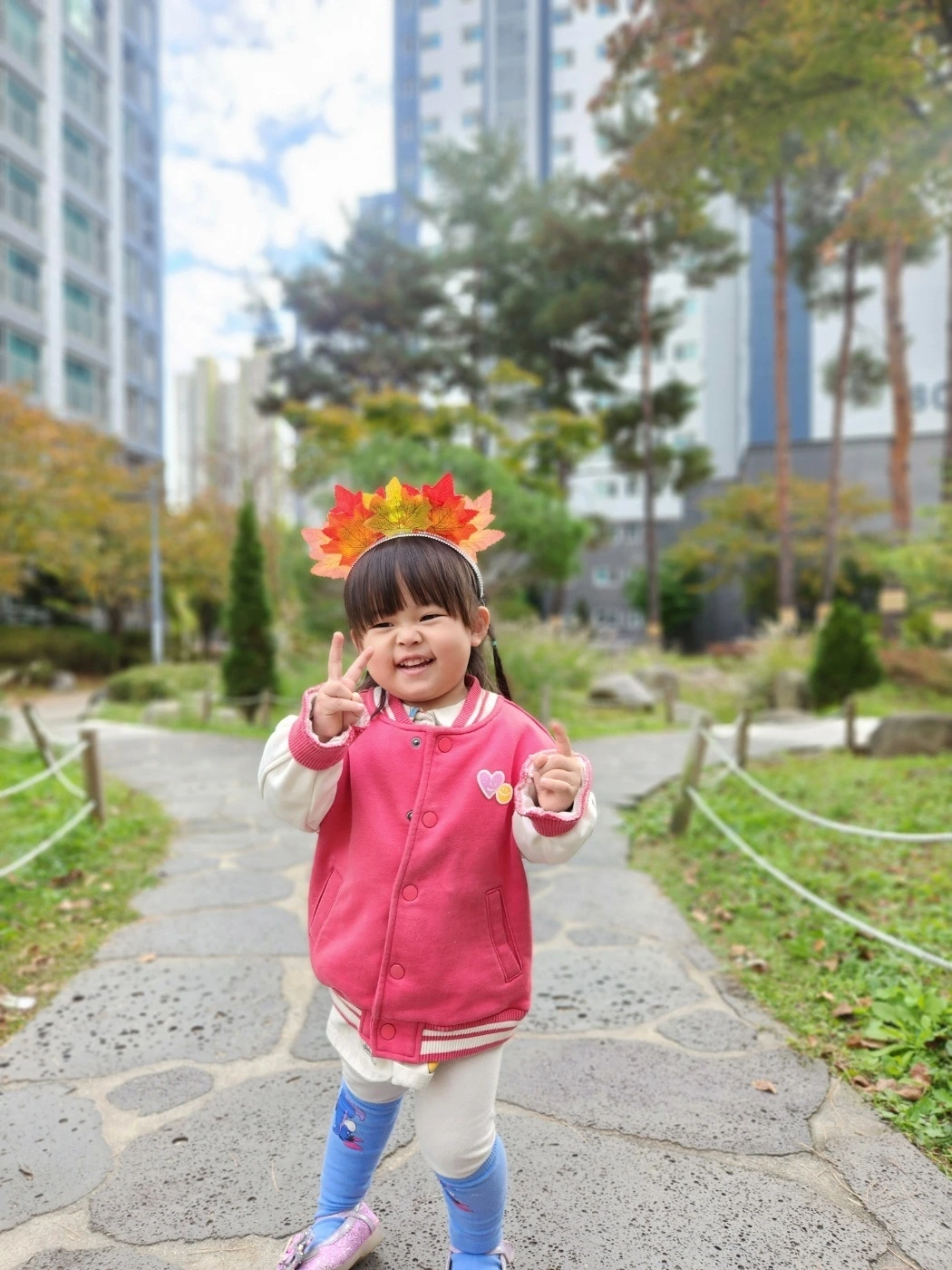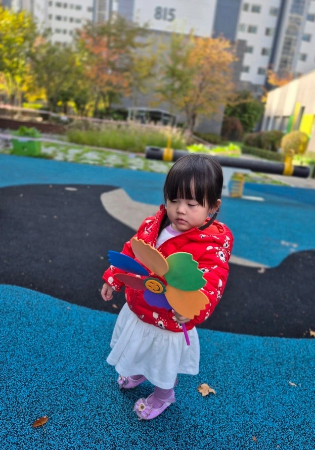점심 먹기 전 매일 어린이집 주변을 산책하는 활동을 하는 데 이번주 달콤이의 픽은 '바람개비'와 '머리띠'였습니다. 바람개비를 손으로 돌려보다가 친구들이 바람개비를 쥐고 뛰는 모습을 보더니 우사인 볼트 빙의한 것 마냥 놀이터 이곳저곳을 쏜살같이 달렸다고 합니다. 세게 뛰면 뛸수록 더 빠르고 많이 돌아가는 바람개비의 모습을 인지한 후 숨이 턱밑까지 차오를 때까지 뛴다고 하니 '그래야 역시 우리 딸이지'라는 생각과 '어린이집 선생님들 힘드시겠다'라는 생각이 공존하는 순간이었습니다. 담임선생님과 함께 오물조물 예쁘게 만든 머리띠도 스스럼없이 잘 쓰고 다니는 모습에서 어린이집 선생님과 얼마나 많은 래포가 형성이 되었는지를 느낄 수가 있었습니다. 머리띠... 집에서는 좀처럼 하는 법이 없거든요.