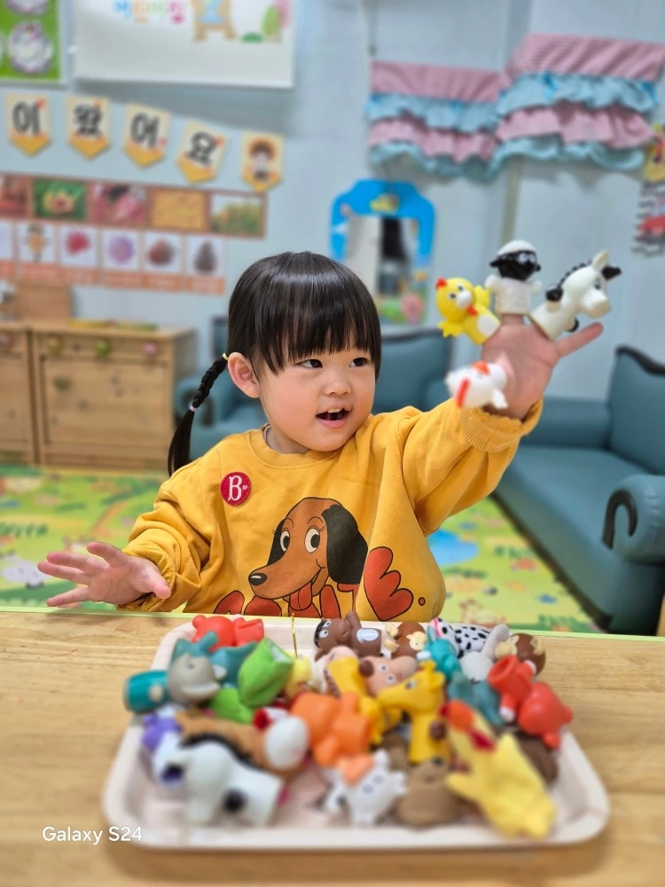같은 시각 만 1세 반 달콤이는 꿔다논 보릿자루 신세였던 지난 주말을 뒤로 한채, 누구보다 어린이집에서 즐거운 한때를 보냈습니다. 화요일마다 진행되는 '스토리오감' 시간에는 저축을 주제로 수업을 들었습니다. 어렸을 때 저도 즐겨 듣고 불렀던 '땡그랑 한 푼' 동요를 익히면서 반짝반짝한 동전을 저금통에 모으는 수업을 하였습니다. 저금통에 한 푼, 두 푼 모은 돈으로 달콤이가 좋아하는 물건을 살 수 있다는 설명을 열심히 들었다고 합니다. 그리고 달콤이는 놀이시간마다 요즘 부쩍 빠져있는 동요인 '손가락 놀이' 동요를 부르면서 동물 친구들을 하나씩 자신의 손가락에 끼우곤 합니다. 집에서도 '손가락 놀이 동요 부를래'라고 매일같이 요구하는 모습을 보니 이번주말까지 쭈욱 손가락 놀이에 빠져있을 심산인 모양입니다.