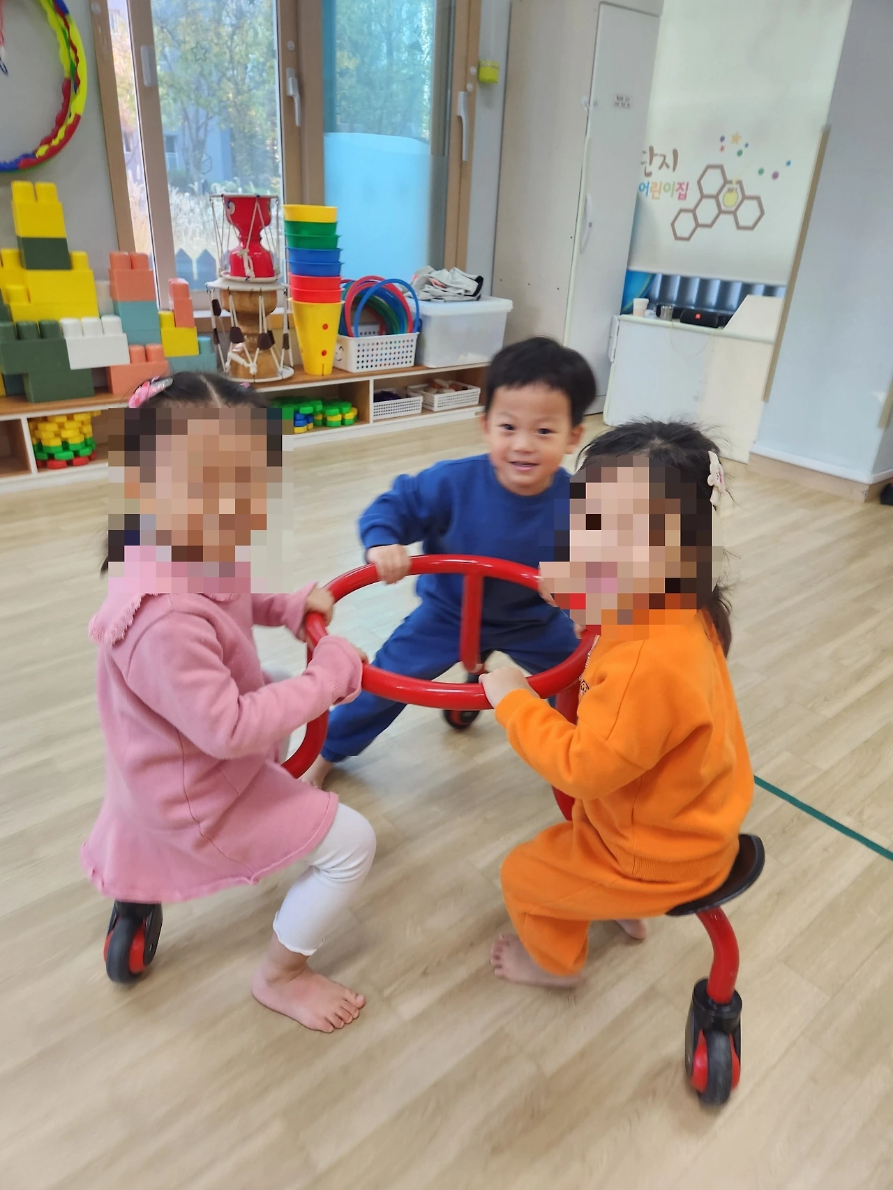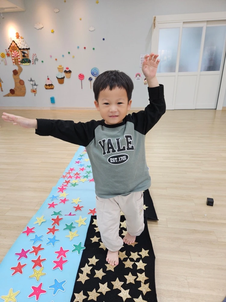 그리고 체육 시간에 균형감을 기르는 여러 가지 활동을 해보았습니다. 친구들과 셋이서 협동 자전거를 타면서 방향감과 평형감각을 기르는 것은 물론, 협동심을 배양해 보았는데요. 역동감이 느껴지는 허니의 모습이 인상적이었습니다. 알록달록한 별들로 꾸민 종이를 건너가는 활동도 마찬가지로 평형성을 기르는 데에 많은 도움을 주는 활동이었습니다. 겨울을 준비하는 기간인 만큼 이번주 허니의 수업은 대부분 실내에서 집중적으로 이루어졌습니다. 하긴 그동안 약 8개월가량을 거의 빠지지 않고 외부 수업을 병행했으니 이 정도의 쿨링 타임은 필요하지 않을까라고 생각해 봅니다.