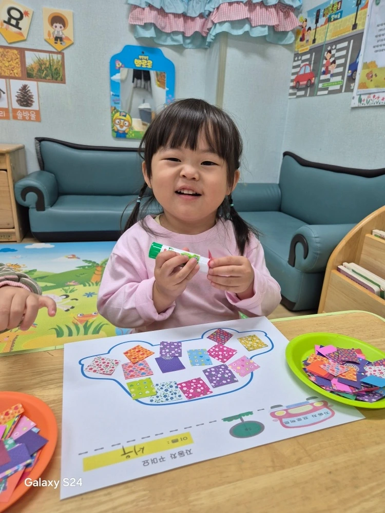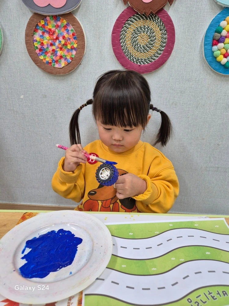같은 시각, 만 1세 달곰이는 어린이집에서 다양한 공작활동을 하며 시간을 보냈습니다. 자기 스스로 색종이에 풀을 붙여 자동차를 꾸미기도 하고 바퀴에 물감을 묻혀 길을 따라 색칠도 해가면서 말이죠. 이번 주에 달콤이에게서 두드러지게 나타난 특징은 바로 '자율성'인데요. 주어진 대로 사물을 받아들이기보다는 오히려 사물을 자기 스타일로 꾸밀 수 있다는 것이 바로 그것입니다. 색종이로 자동차를 꾸밀 때도 자신이 좋아하는 무늬를 골라 취향에 맞게 배합해 낼 수 있고요. 바퀴도 자기가 좋아하는 색깔을 골라 색칠할 수 있습니다. 스스로 무언가를 자신만의 방향으로 자유롭게 해낼 수 있다는 것을 몸소 보여준 달콤이의 하루에 박수를 보냅니다.
