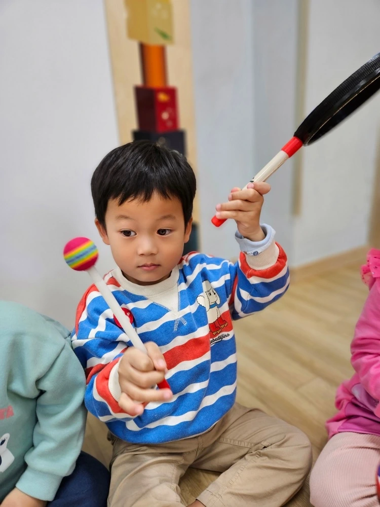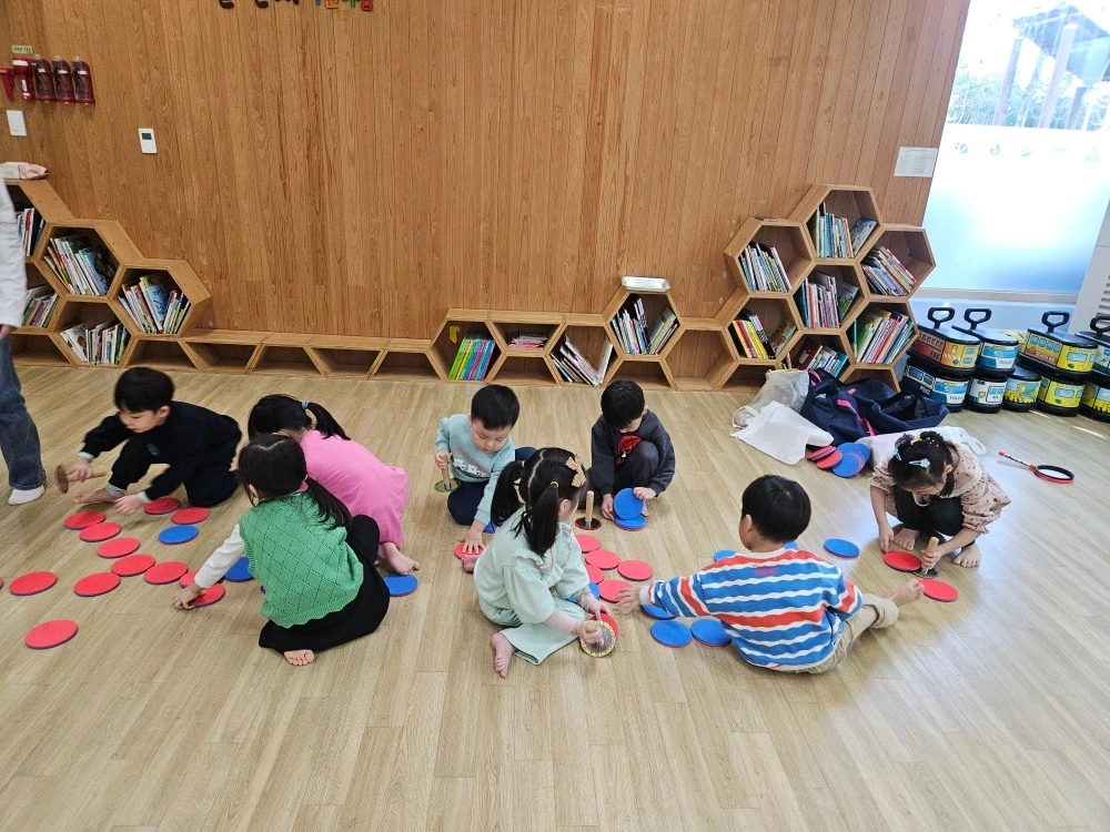만 3세 반 허니는 위드팡팡 시간에 친구들과 함께 사탕 모양의 '롤리팝 드럼'을 연주하며 고장 난 로켓을 연주하는 시간을 가졌습니다. 또한 빨간면과 파란면이 함께 있는 판을 자유롭게 관찰하면서 반죽놀이 하는 상황을 자연스레 연출하였습니다. 어린이집 운동회 때도, 주말마다 방문하는 놀이체육 학원에서도 자주 볼 수 있었던