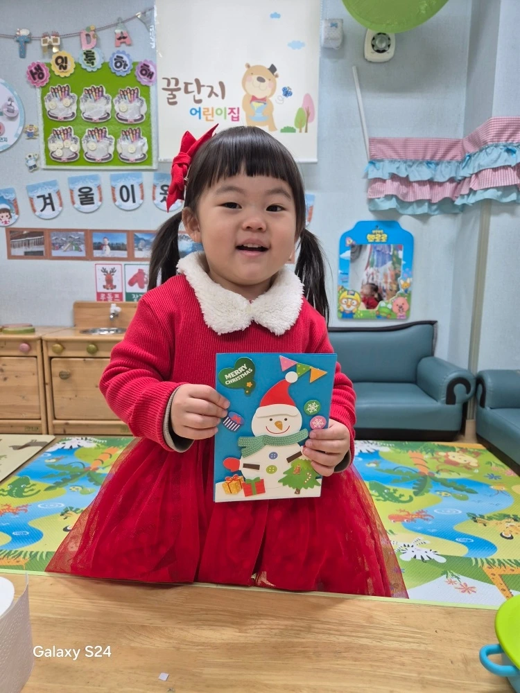 만 3세 반 허니는 어쩌면 올 크리스마스가 어린이집에서의 마지막 크리스마스일지도 모릅니다. 왜냐하면 집 근처 유치원 모집에 합격하였기 때문이죠. 이미 유치원 8일 차에 어린이집으로 컴백한 사례(?)가 있기에 유치원 적응을 장담하긴 아직 이릅니다. 그런데 작년과 다른 점은 어린이집 친구 여러 명과 같은 유치원을 다닌다는 사실입니다. 낯선 환경에 적응하는 데 있어 '친구'가 가장 큰 전제 조건인 허니이기에 내년도 유치원 적응은 조금 기대해 볼 만합니다.