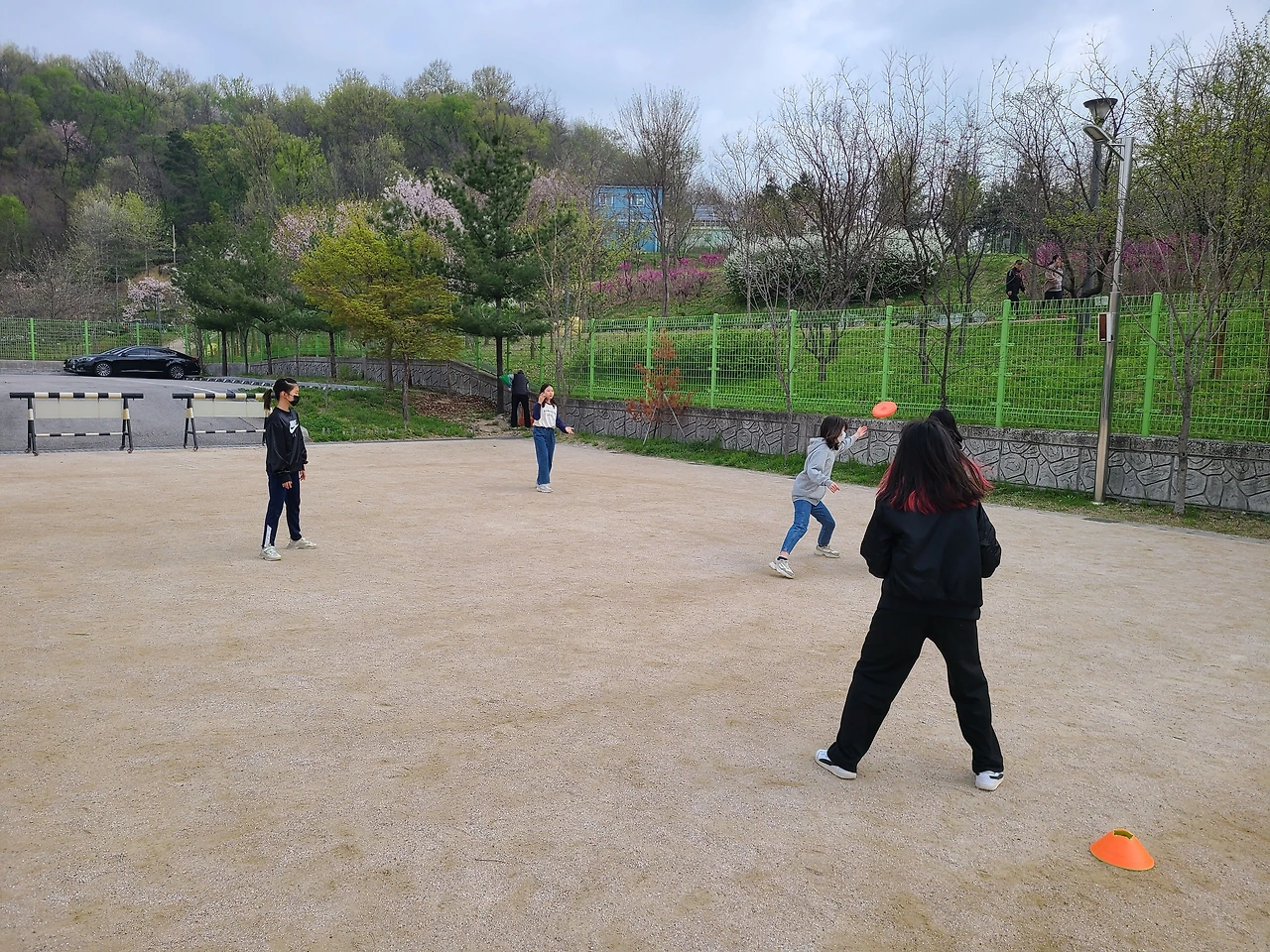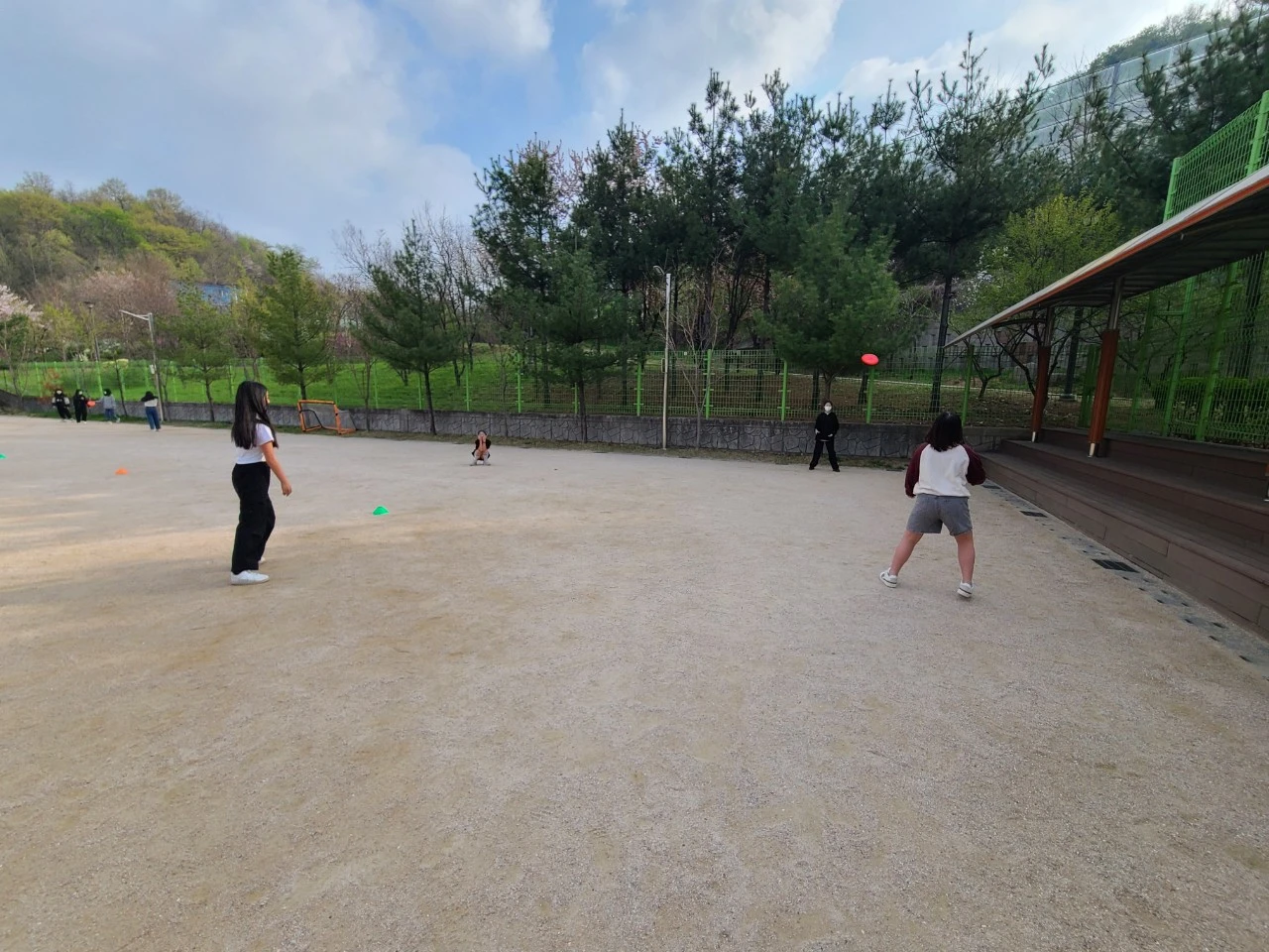 갑자기 운동장 스탠드 한 구석에서 벼락같은 비명소리가 들렸다. 살펴보니 주은이와 다언이가 플라잉디스크를 주고받고 있었다. 아직 익숙하지 않아 제대로 주고받기가 안되어 놓칠 때마다 비명을 지르는 모양새가 요란했다.