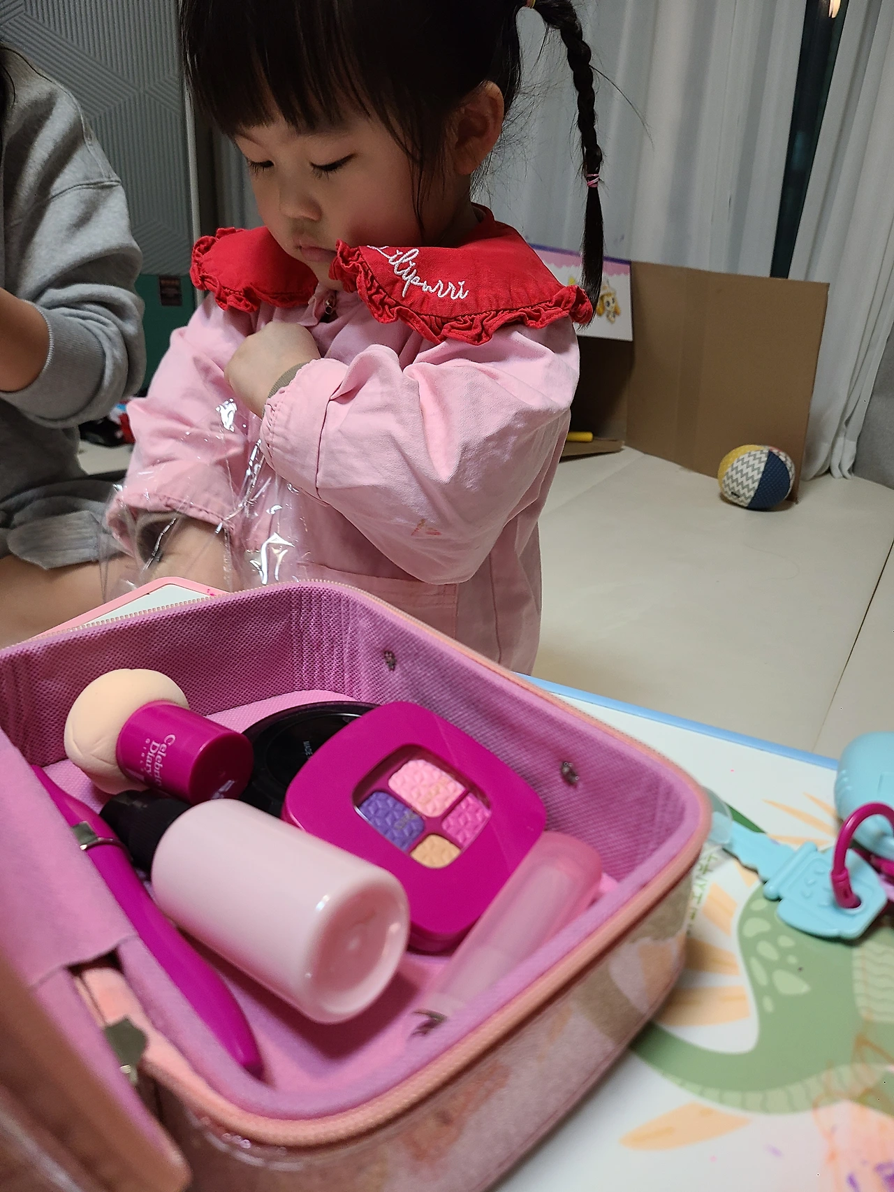 폭풍 같은 4시간이 지나고 생일축하파티의 아쉬움을 선물 상자 개봉으로 달래 보았습니다. 둘째가 받은 첫 번째 건물은 요즘 부쩍 둘째가 관심을 갖는 메이크업 박스였습니다. 천생 여자임을 숨길수가 없는지 누가 한번 가르쳐준 적도 없는데 화장품을 갖고 노는 모습이 예사롭지 않습니다. 단언컨대 둘째는 저보다 화장 도구 사용법을 정확하게 알고 있을 것입니다. 선물을 받자마자 거울을 보며 아이섀도를 그리는 모습을 보니 흐뭇하더군요.