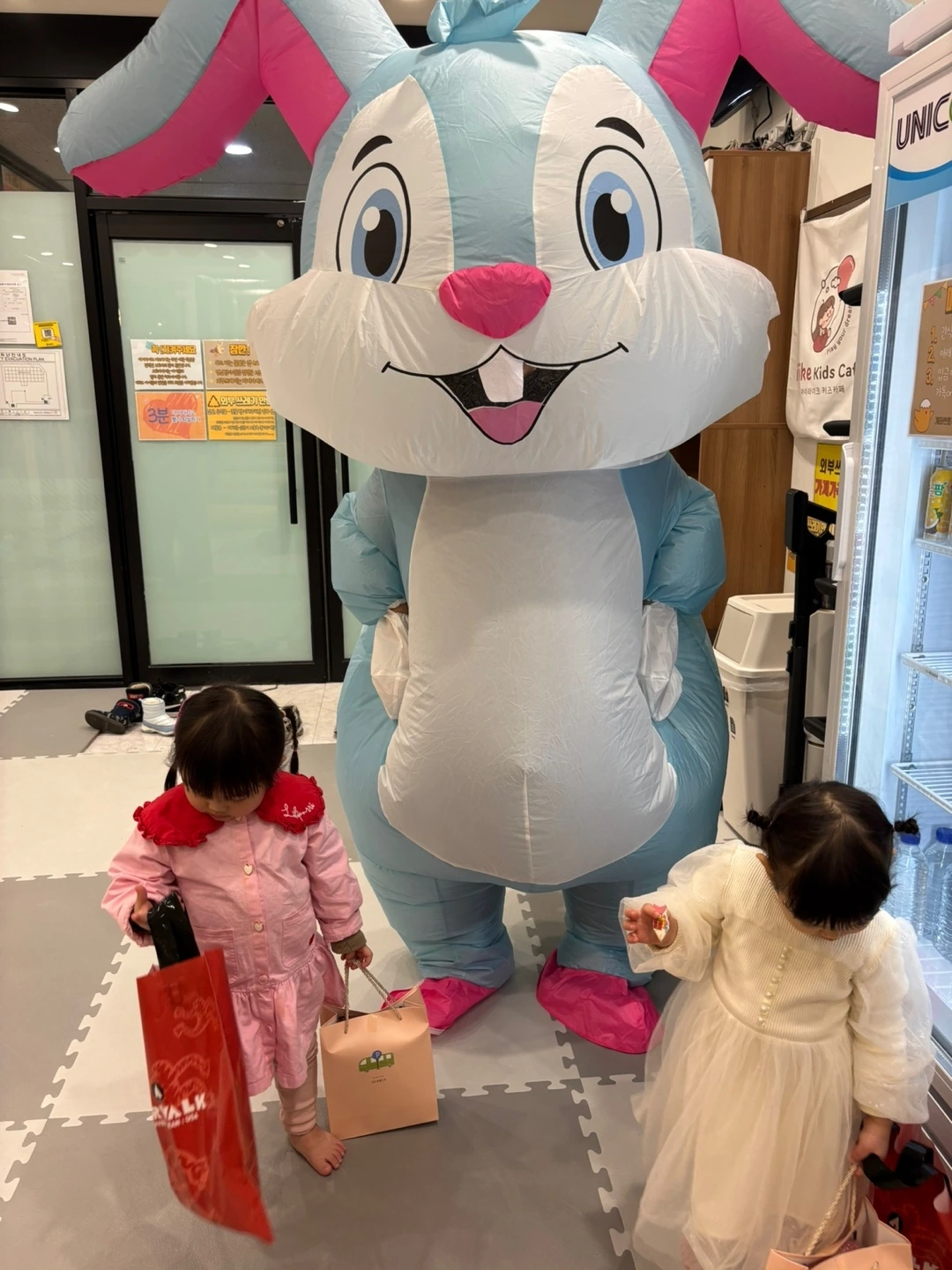 한 가지 재미있는 사실이자 공통점은 둘째의 친구들도 모두 집에서 '둘째'라는 점입니다. 심지어 첫째가 초등학생인 부모님들도 계시죠. 그러다 보니 한층 육아에 대해 수월성과 전문성을 갖춘 베테랑들의 축하 무대를 엿볼 수 있었습니다. 키즈카페에서 괴물이 되거나, 경찰이 되는 역할놀이뿐만 아니라 대형 토끼가 되어 주인공들의 생일을 축하해 주는 퍼포먼스까지 선보이시더군요. 덕분에 아이들은 불을 발견한 인류처럼 눈이 휘둥그레 해지면서 거대 토끼의 축하를 받을 수 있었습니다.