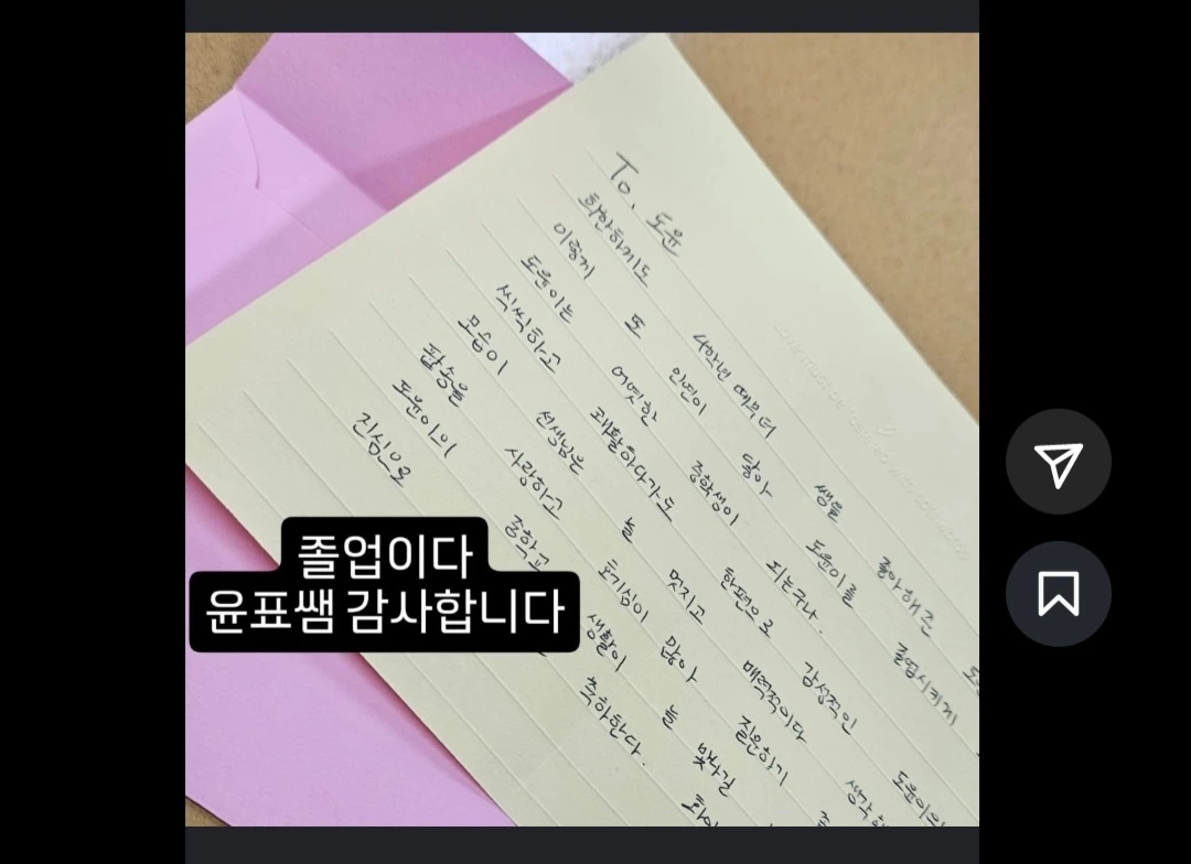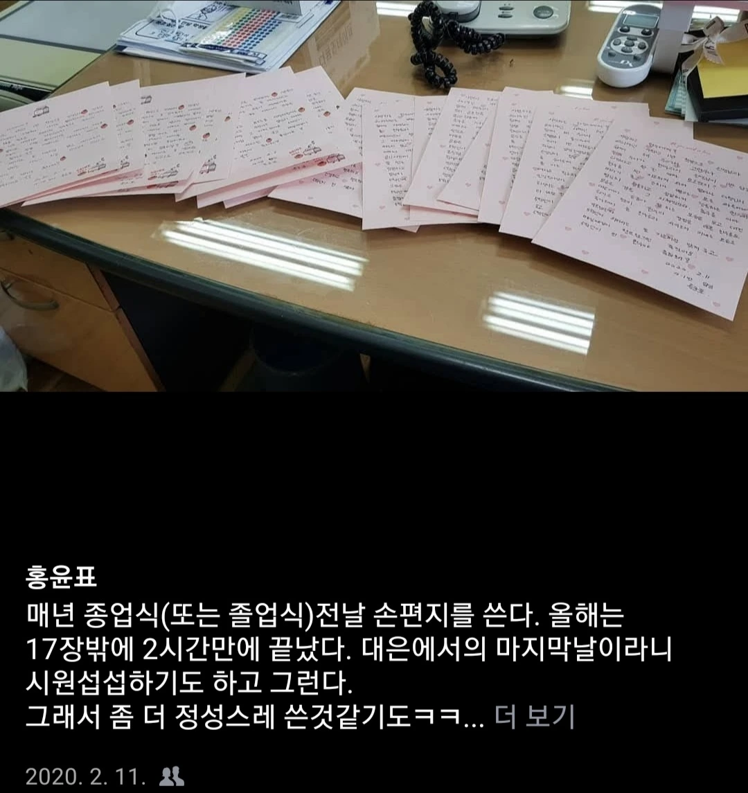 교직생활을 하면서 담임인적도 있고 아닌 적도 있었습니다. 그중에서 담임을 맡을 때마다 꼭 빠지지 않고 학년도의 마지막날 손 편지를 써서 주었습니다. 졸업식 전 날 아이들에게 너희가 받고 싶은 편지지와 카드의 색깔을 고르게 한 뒤 이름을 적어두었습니다. 업무를 마치고 집에 돌아와 육아가 끝나면 밤에 쓰려했는데 제 체력이 받쳐 주지 않아 깜빡 잠이 들었습니다.