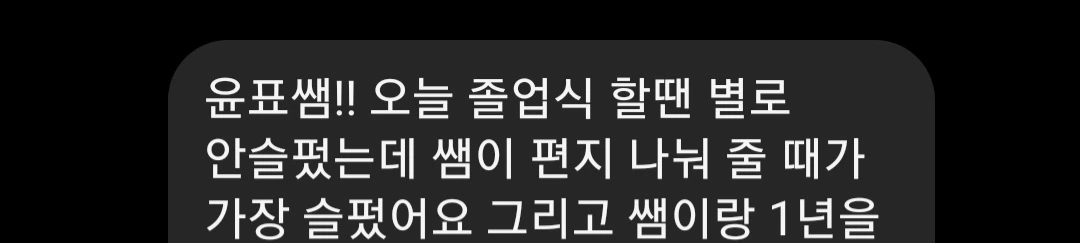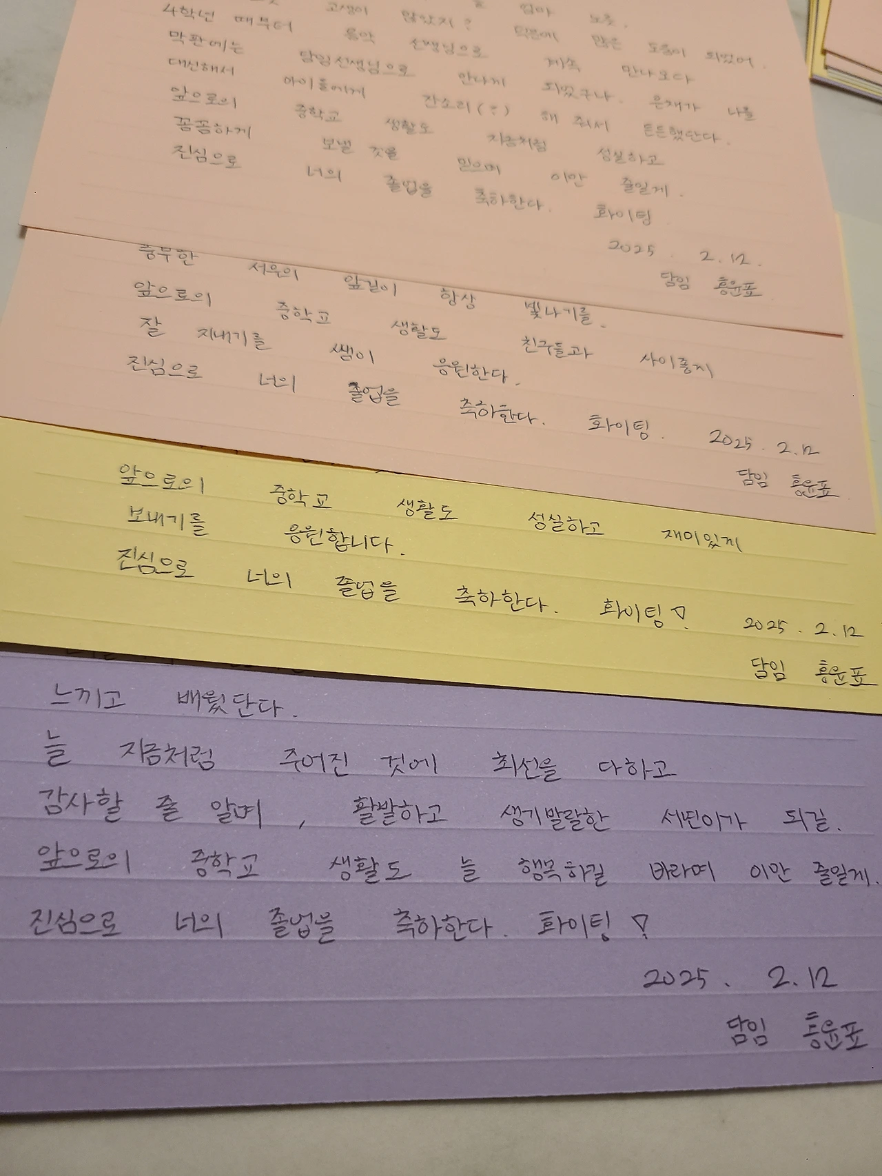 그렇게 마지막 18번째 손편지까지 다 쓰고 그날 아침 아이들의 이름을 한 명씩 불러 직접 쓴 손 편지를 주었습니다. 아이들이 어떻게 느꼈을지 모르지만 저의 진심을 나름 꾹꾹 눌러 담아 썼다는 것을 알아주었으면 합니다. 그렇게 졸업식을 마치고 2024년 학사일정이 공식적으로 마무리되었습니다. 나를 만나 생활했던 모든 학생들이 2025년 새로운 시작을 잘 해내어 앞으로의 인생을 멋지게 살았으면 하는 바람입니다.