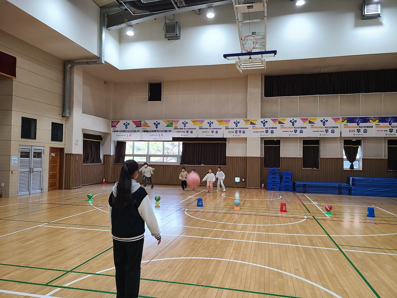 늘봄 4회 차 수업은 체육관에서 40분, 교실에서 40분 진행하기로 하였습니다. 어제 졸업식과 종업식을 마친 6학년, 1학년이 함께 놀이체육 시간을 보냈는데요. 엄밀히 말하면 오늘 이 시간 부로 중1(진), 초2(진)이 맞겠다고 볼 수 있군요. 예비 중학생들이 먼저 수업을 여는 몸풀기 게임을 선보였습니다.