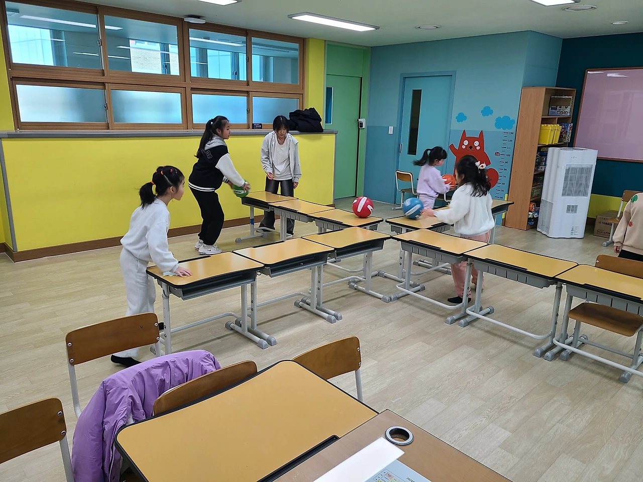 4. 술래가 공을 가지고 있지 않을 때, 학생들은 몸을 움직여 눈앞에 있는 물건 중 원하는 것 한 가지를 가져갑니다.