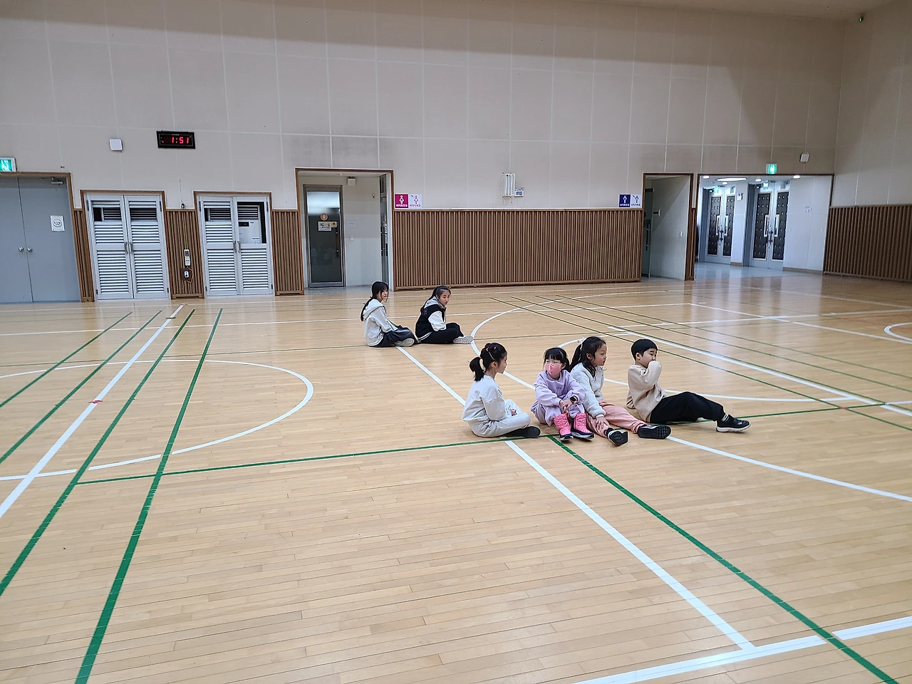 1. 학생들은 모두 체육관 벽에 손을 짚고 서서 대기합니다.