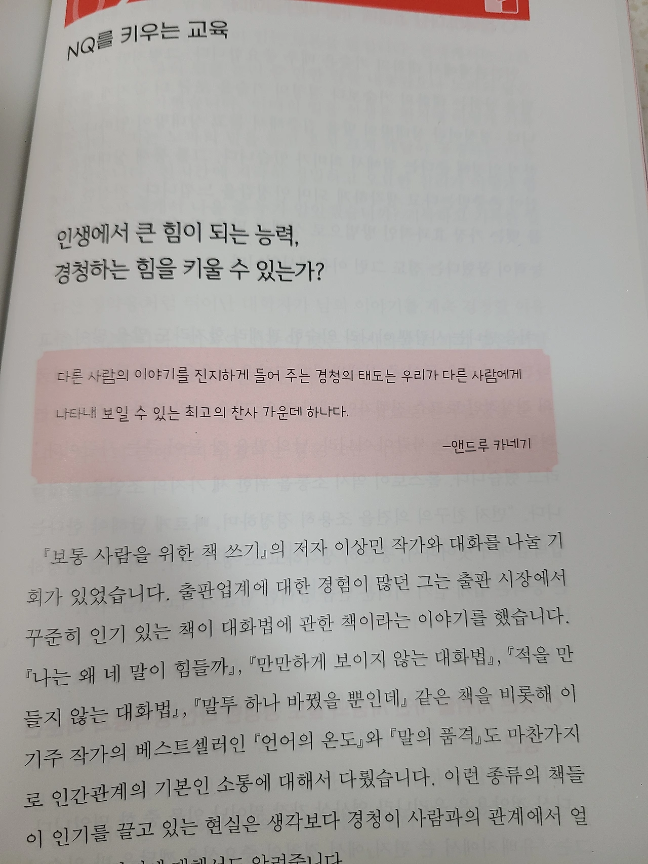 그렇게 재미있는 이야기를 하면서 각자의 가정에 충성(?)을 다하기 위해 카페를 나왔습니다. 작가님도 그렇고 저도 그렇고 무엇보다 공감과 경청이라는 키워드의 중요성에 대해서 많은 것을 느꼈다고 한 목소리로 말하면서 말이죠. 그렇게 집으로 오는 길에 작가님의 저서에서 '경청'에 대한 챕터를 다시 한번 읽어보며 오늘을 복기했습니다. 그리고 오늘 과연 나는 충분히 '경청'했는지 생각해 보았습니다.