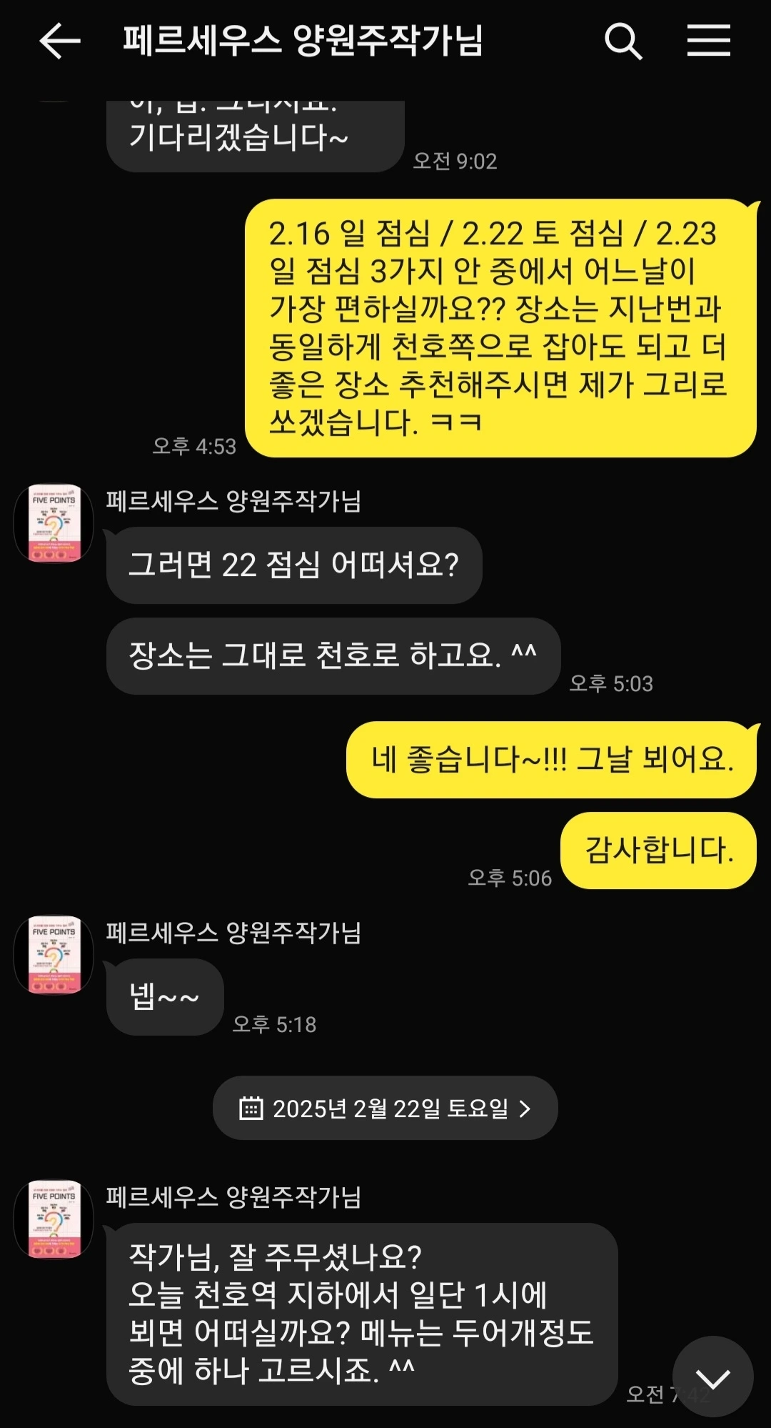 늘 맞이하는 주말이지만 저에게는 이번 주말이 기대 반, 긴장 반의 감정이 가슴속에서 요동쳤습니다. 왜냐하면 '브런치스토리'를 통해 알게 된 '페르세우스' 양원주 작가님을 직접 만나 뵙는 날이었기 때문입니다. 평소에 자녀교육과 아빠 육아에 대한 글을 수년간 매일 쓰고 계심은 물론, 그와 관련된 콘텐츠를 모아 집대성한 '파이브 포인츠'의 저자이시기에 오늘의 만남이 더욱 뜻깊게 다가왔습니다. 행여나 작가님과 만남에서 제가 우를 범하진 않을까, 나에 대해서 갖고 계셨던 이미지를 깨뜨리는 행동을 하지는 않을까라는 걱정도 함께 왔고요. 사전에 전해 둔 약속 장소로 한달음에 달려가 인사를 드리니 반갑게 저를 맞이해 주셨습니다. 맛있는 점심도 사주시고 말이죠.