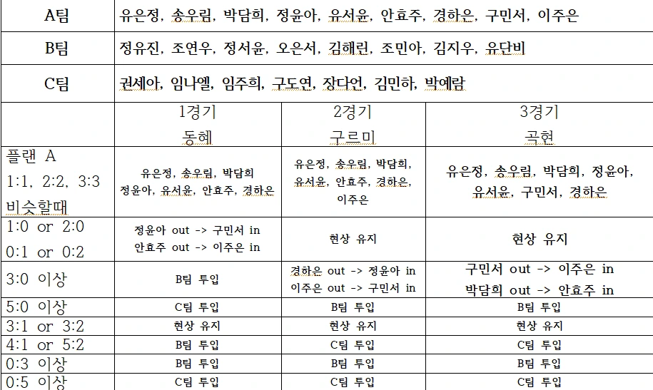 “이게 그동안 너희들이 연습 경기 결과를 지금까지 정리해 놓은 데이터다. 이걸 보면 어떤 선수가 득점을 많이 했는지, 수비 성공률이 높았는지 파악할 수 있다. 그리고 이걸 바탕으로 짜 놓은 오늘 경기의 경우의 수고.”
