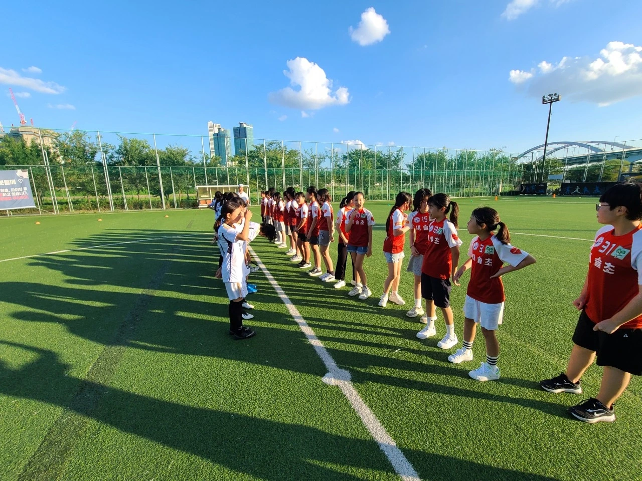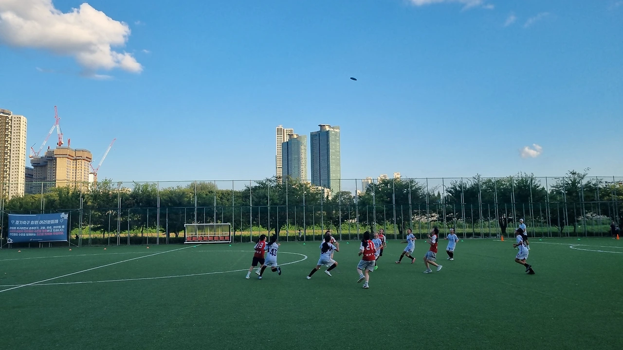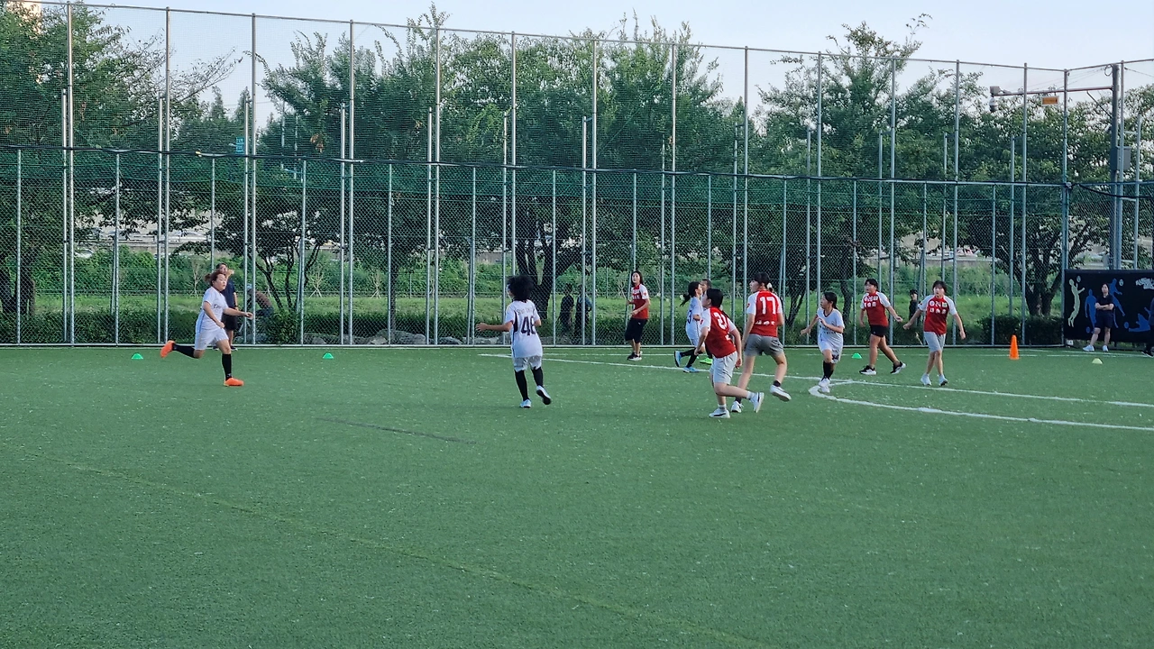 A조 선수들 7명이 일제히 자리에 일어나 경기장으로 뛰어들어간다. 이전 경기와 마찬가지로 은정이, 우림이, 하은이가 후방 라인을 맡고 왼쪽에 윤아, 오른쪽에 서윤이가 위치해 있다. 최전방에는 활동량이 좋은 주은이와 민서가 전반전에 나선다.