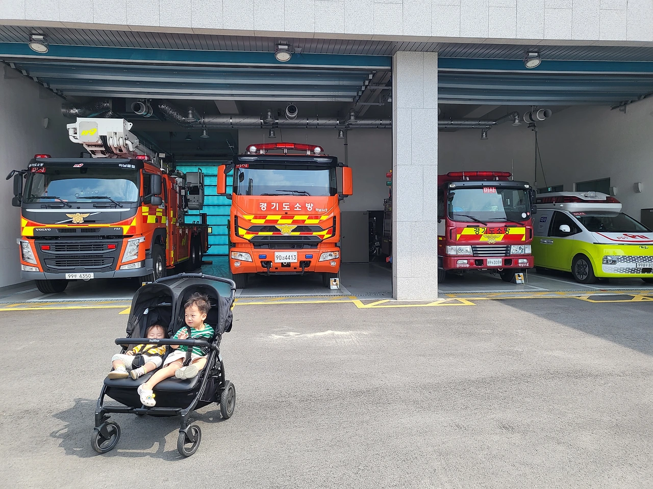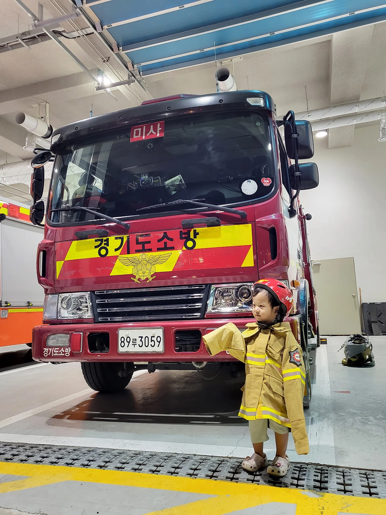 그러던 어느 날, 동네 마실 겸 유모차 산책을 하다 우리 아들이 우연히 소방서를 지나간 적이 있었다. 늘 TV로만 보던 소방서와 소방차를 실제로 보니까 몹시 기뻐하는 눈치였다. 유모차에서 내려 이리저리 탐색할 시간을 주었다. 그런데 소방차와 구급차 사이에서 소방관 분들이 작업을 하고 계신 게 아닌가. 다소 실례가 될 것 같아 아들을 다시 데리고 나오려는데 소방관 분들이 친절하고 상냥하게 이렇게 제안해 주셨다.