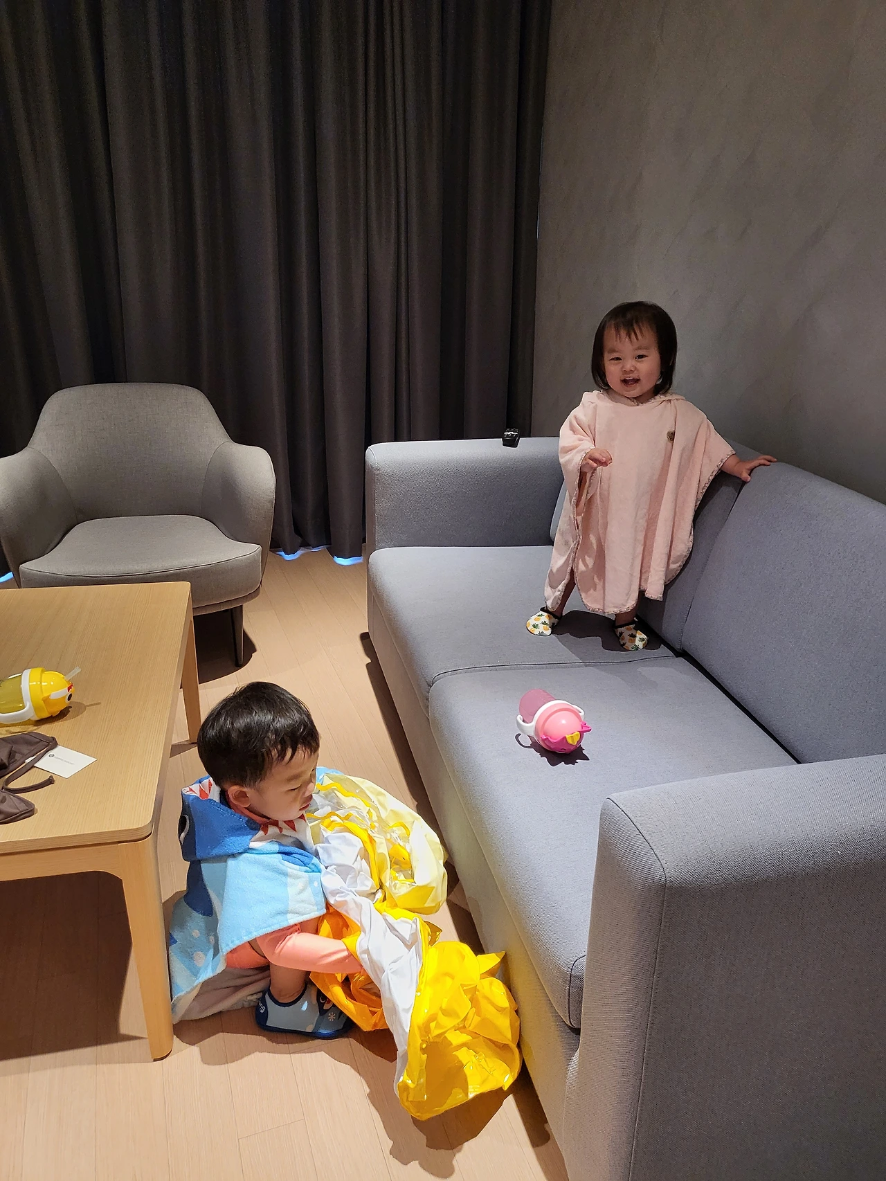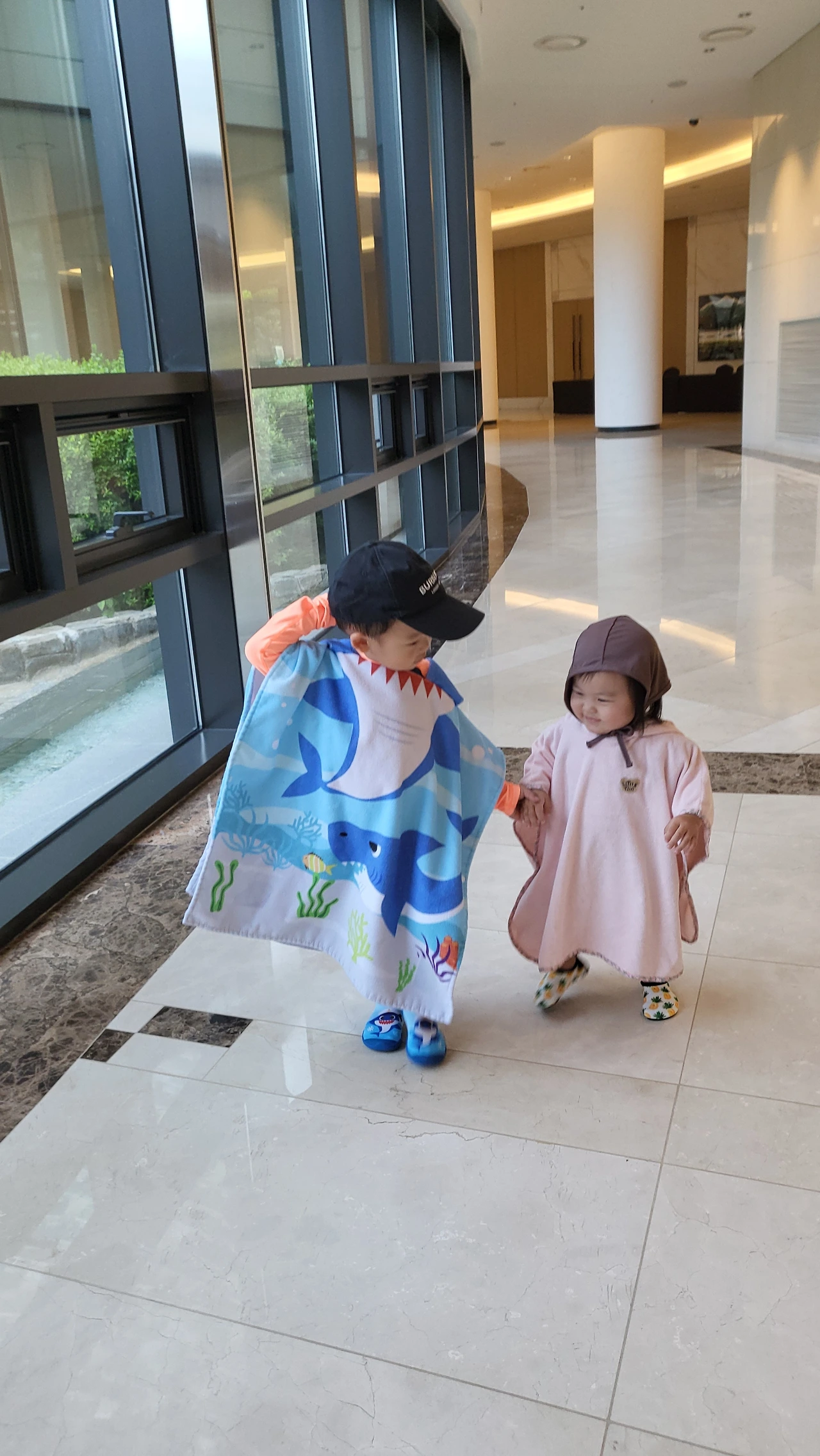 그다음 조건은 물놀이를 할 공간이 무조건 있어야 한다. 그래서 우리 부부는 아이들과 여행 갈 때 짐이 무척 많아진다. 아이들 별로 각각 방수 기저귀와 래시가드를 준비한다. 그리고 취향에 맞게 핑크퐁 튜브를 준비하고 예비로 손으로 바람을 넣을 수 있는 손 펌프도 챙긴다. 인터넷에서 주문한 유아용 정글모와 아쿠아슈즈도 꼭 구비하고, 체온 유지에 필요한 망토 비슷한 것도 준비한다. 재미있는 사실은 아이들은 프라이빗한 수영장을 좋아하지 않는다. 시끌벅적하고 가족 단위로 많은 고객이 수영장에서 웅성웅성해야 텐션이 올라간다. 이 모든 조건을 충족한 장소 역시 또한 '5성급 호텔&리조트'이다.