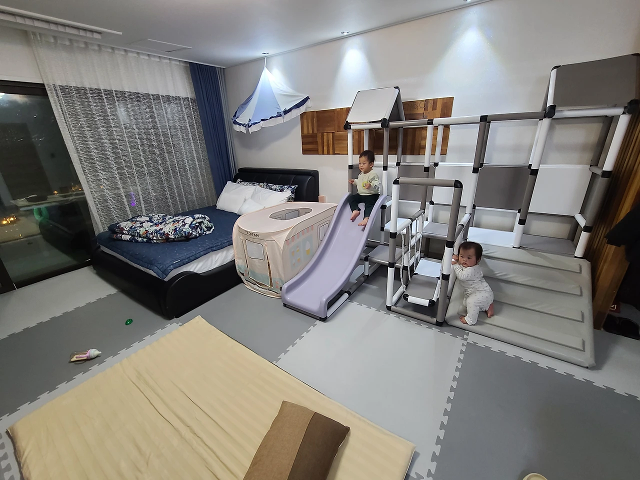 우리 자녀분들에게 숙박의 가장 중요한 부분은 '분리형 구조'이다. 즉 침실과 거실이 분리된 공간이어야 하며 침실에서는 잠을, 거실에서는 잠 이외의 생활을 해야 한다. 이는 우리 가족이 그동안 키즈 펜션, 풀빌라 등에서 무수한 기회비용과 매몰 비용을 투척해 가며 얻어낸 산물 같은 것이다. 원룸형 공간에서 식사와 놀이까지는 아이들도 어느 정도 이해를 하고 별 불편함 없이 놀긴 했다. 그런데 꼭 마지막에 취침하기 전에 문제가 생겼다. 아직 말 못 하는 둘째도 2~30분 내로 자다 깨기를 반복하면서 잠덧을 하였다. 게다가 첫째는 집에 가자고, 잠은 집에 가서 자야 한다는 흥선대원군 격 논리를 펼치기 일쑤였다. 실제로 우리 부부는 자다 말고 첫째가 집에 가자고 성화를 부려 새벽 3시 반에 체크아웃은 개별 연락으로 하고 야반도주하듯 집으로 돌아온 적이 있다.