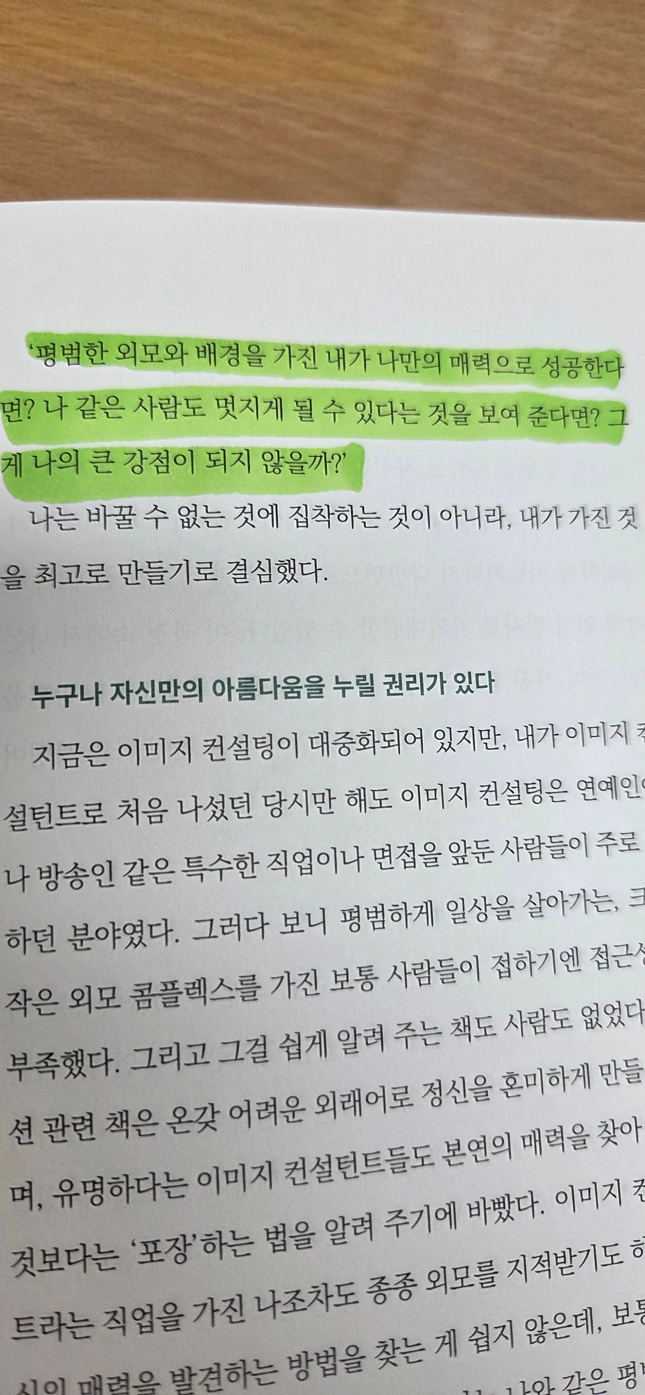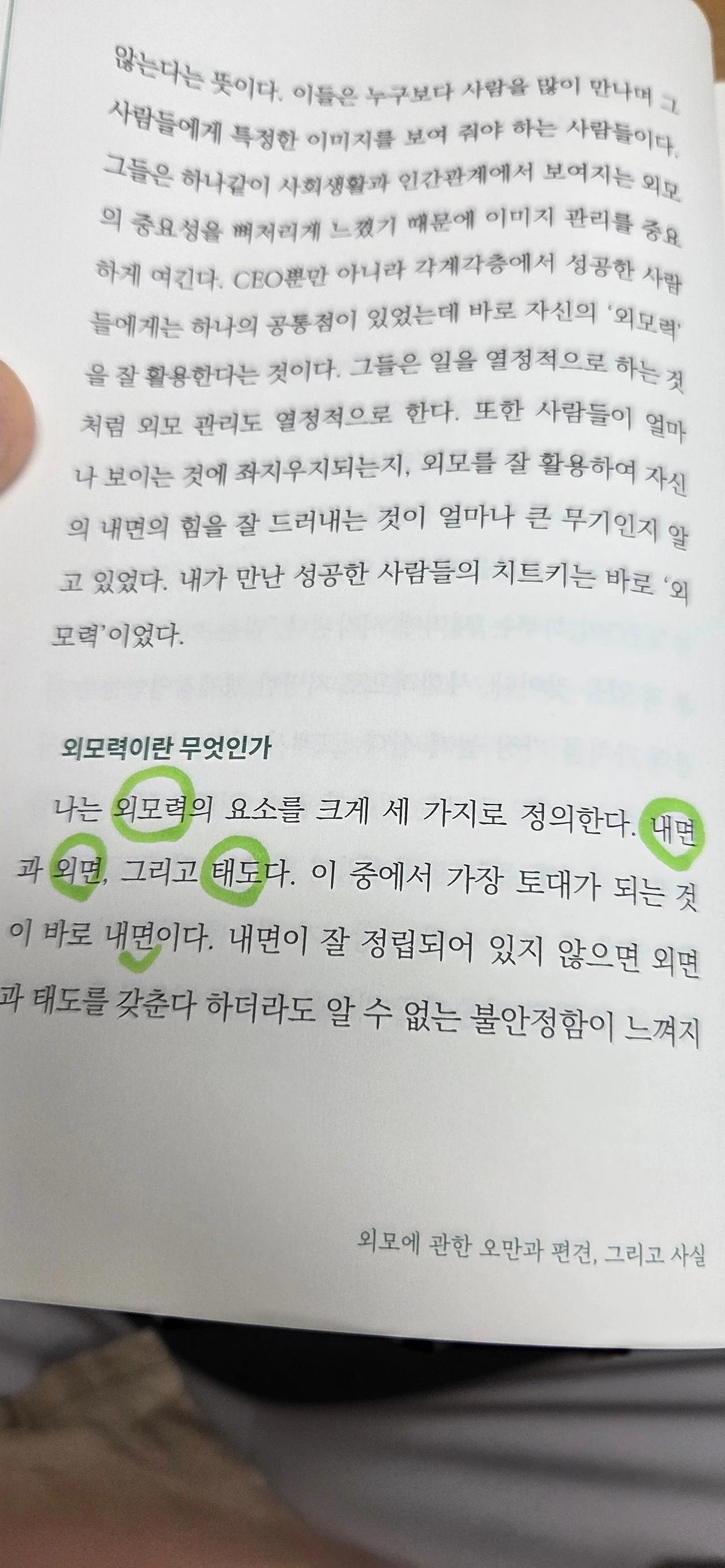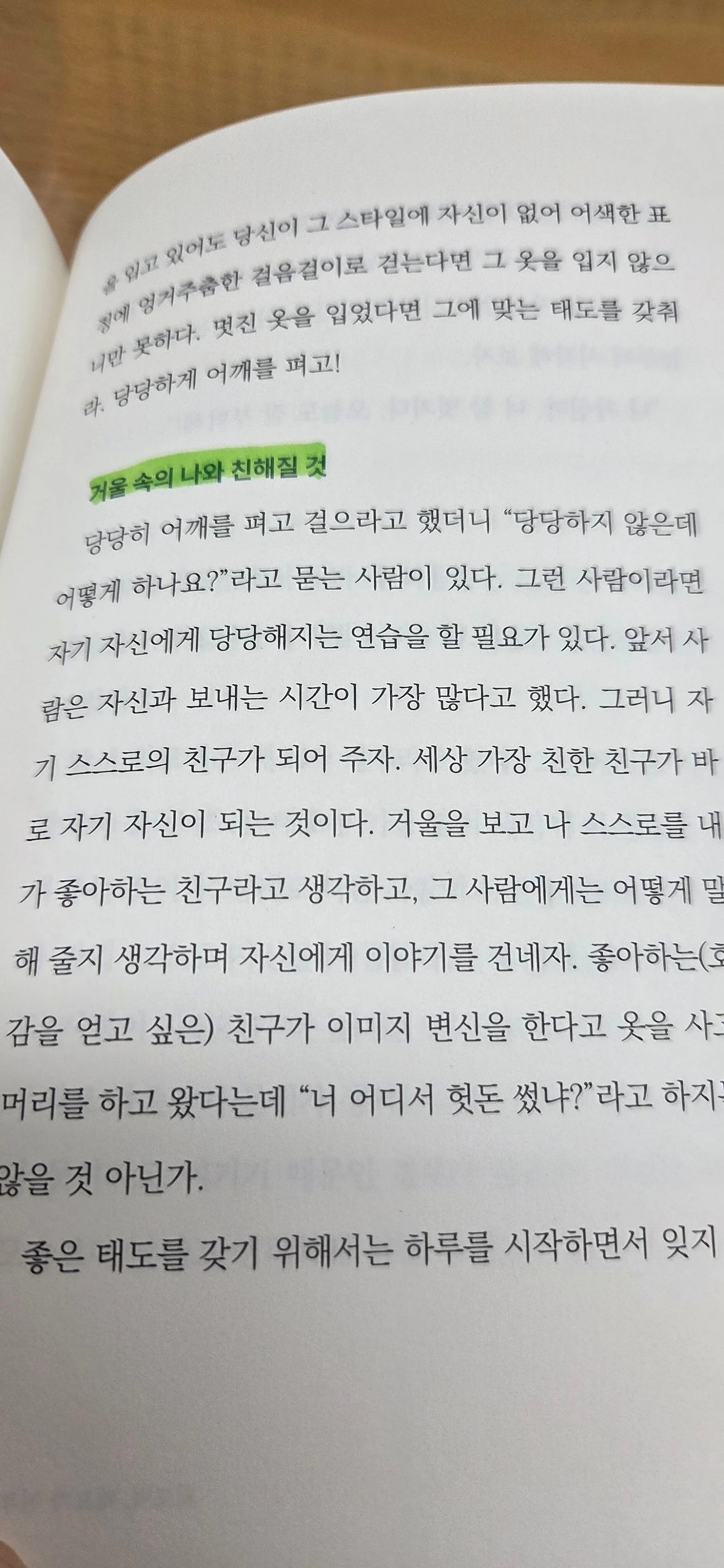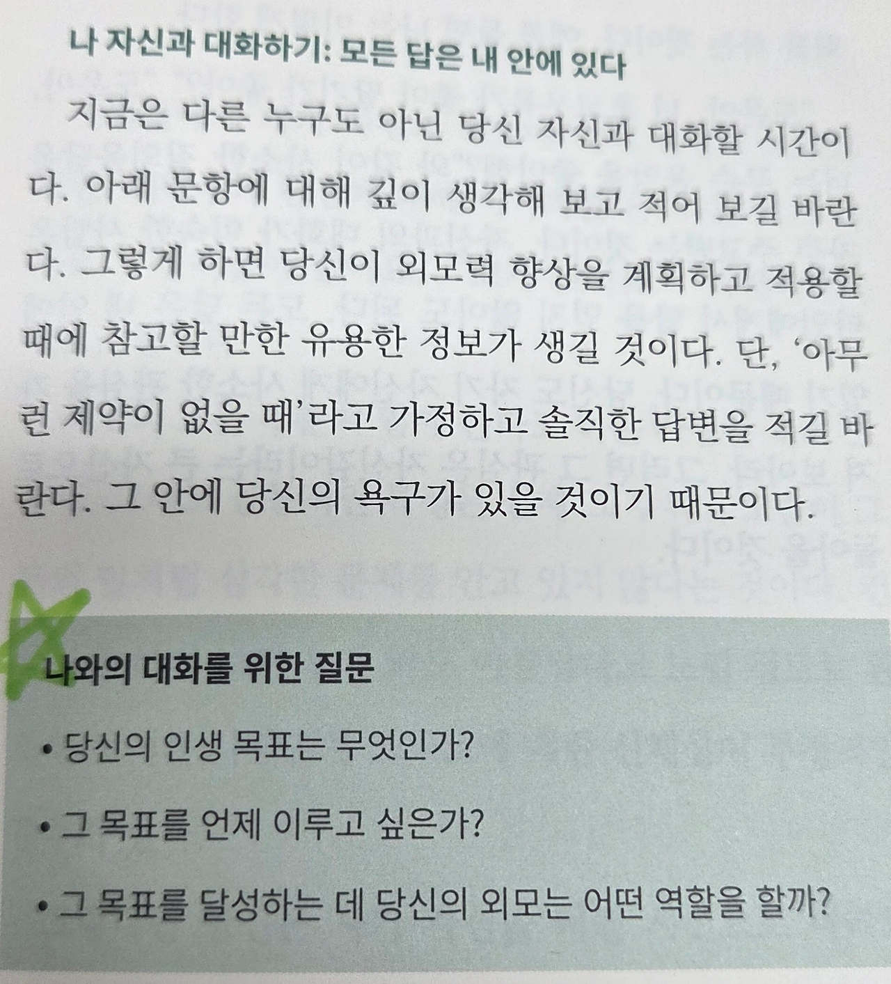 그리고 작가는 외모력을 키우기 위해 거울 속의 나와 친해지기를 권장한다. 거울은 예쁘게 단장하는 데에도 필요하지만 불필요한 습관을 고치는 데에도 한 몫하기 때문이다. 만약 면접을 앞두고 있는 상황인 취준생들에 은 심히 공감할 만한 부분이 아닌가 싶다. 짧은 스피치를 통해 나의 매력을 발산하기 위해 연습하는 것도 거울 앞일 것이요, 과도한 손 제스처나 삐딱한 허리, '어~,' '자~'와 같은 불필요한 추임새를 고치는 것도 거울 앞일 것이다. 그렇기에 거울 속의 나와 친해지며 내가 가진 외모력의 특징을 정확하게 파악하고 그 매력을 극대화시키는 방법을 효과적으로 체득할 수 있다.