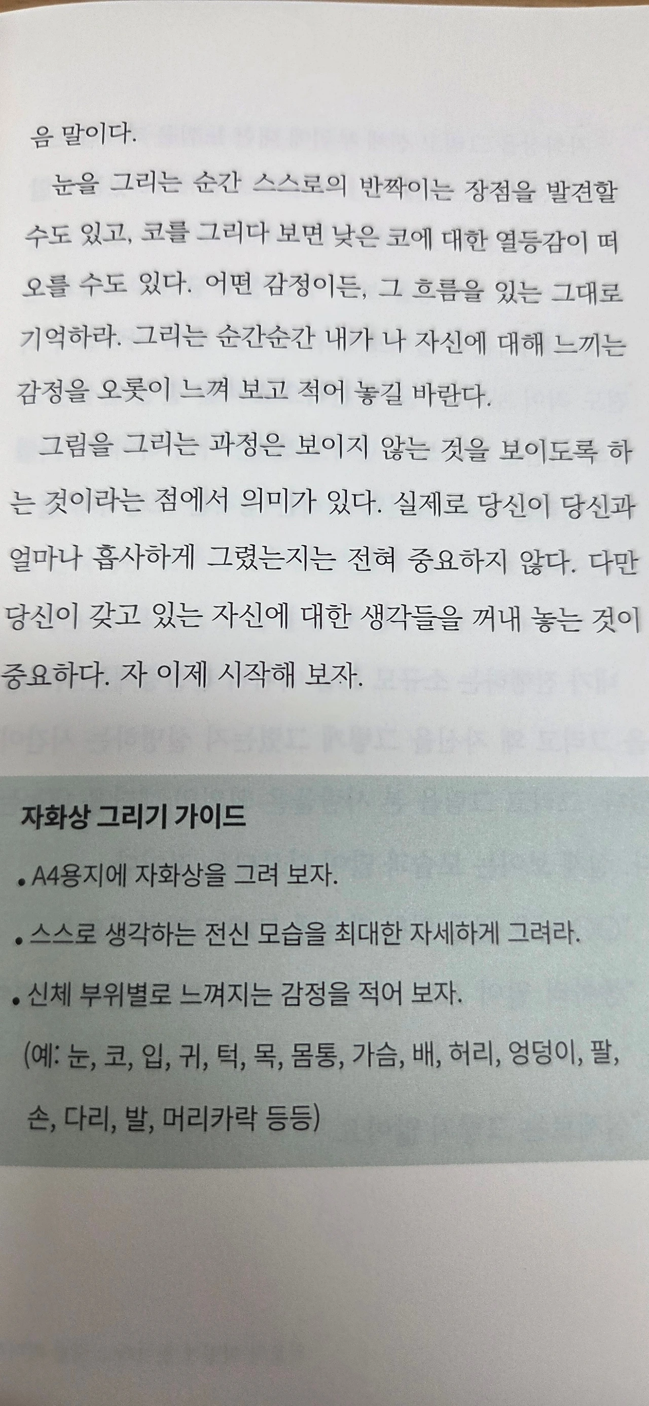 그렇다면 어떻게 해야 나의 '외모력' (나는 한 번도 가졌다고 생각한 적이 없는)을 업그레이드할 수 있을까? 저자는 '자화상 그리기' , '꼬리표 떼기' 등을 통해 외모 콤플렉스를 슬기롭게 극복하고 자신만의 매력으로 승화시킬 수 있다고 말한다. 그러고 보니 세월이 흐를수록 외모 콤플렉스에 대해 무던해지고 나름대로 이를 나만의 매력이라고 잘 어필을 해왔던 듯하다. 유난히 두꺼운 입술이 콤플렉스라 어렸을 때부터 혼혈인이란 별명도 가졌고 군대에서도 담당관으로부터 '썰면 3 접시'라는 별명을 가졌던 나이지만 이제는 입술이 매력포인트라는 사실을 암암리에 깨달았기 때문이다. 그래서인지 가르치는 학생들도 30초면 내 자화상을 그릴 수 있을 정도로 입술은 나를 대표하는 차밍 포인트가 되었다.