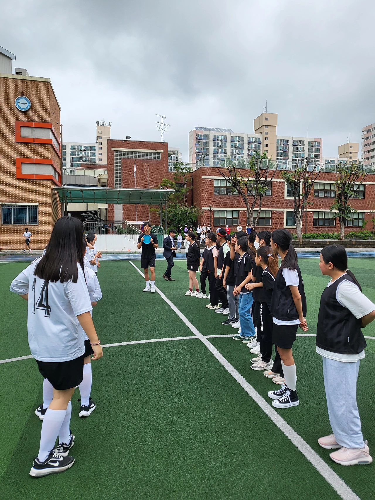 작년에는 남학생만으로만 꾸렸으니 올해는 남, 여 투 트랙으로 구성해서 대회를 참가해 보기로 했다. 공문이 오기 전인 4월부터 매일 아침 40분씩 지도를 했고 작년만큼은 아니지만 어느 정도 자체 청백전이 가능할 정도로 수준을 끌어올렸다. 그리고 지난 6월 21일, 여학생 플라잉디스크 본선 장소로 향했다. 주변 학교의 시선이 느껴졌다. 플라잉디스크 종목 작년 서울시 대표가 왔으니 그럴 만도 하다.