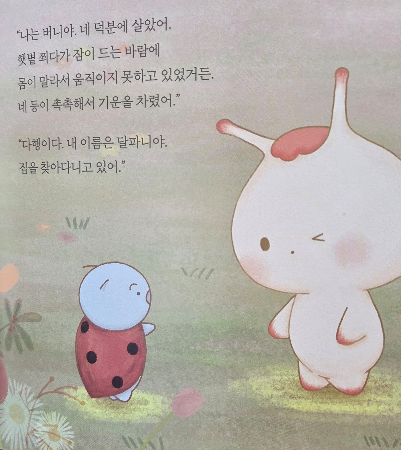그렇게 집을 찾아 떠난 '달파니'. 자신에게 어울릴까 안아봤던 솔방울은 너무 따갑고 예뻐서 가져온 꽃잎은 한 줌 바람에 너무도 쉽게 날아가버린다. 그러던 중에 나뭇잎 위에 동글동글하고 반짝이는 것이 있어 살짝 만져보니 작은 무당벌레 한 마리였다. 무당벌레는 몸이 말라서 움직이지 못하다가 달파니의 손길에 기운을 차리게 되었다. 무당벌레 '버니'는 자신을 도와준 달파니를 위해 함께 집을 찾아 나서 주기로 한다. 모험에 있어 동료가 생겼다는 것은 그 존재 자체만으로도 커다란 힘이 되는 것을 일깨우는 순간이다.
