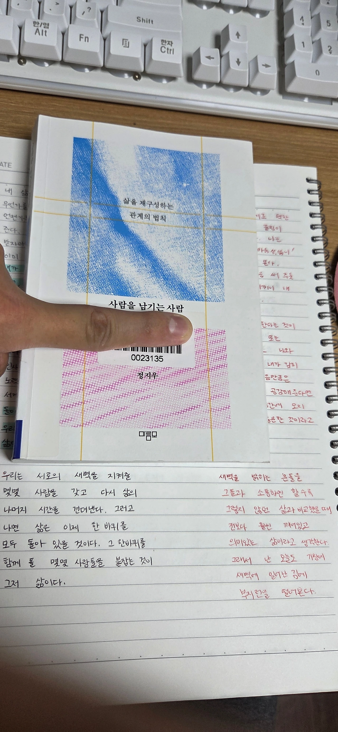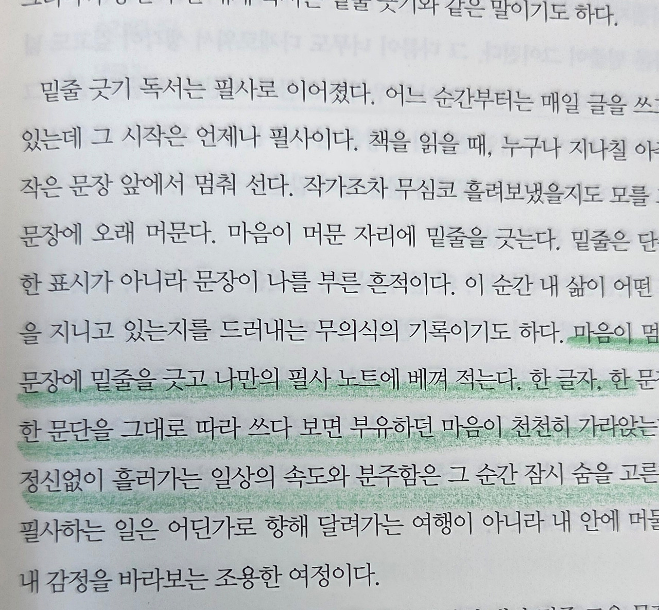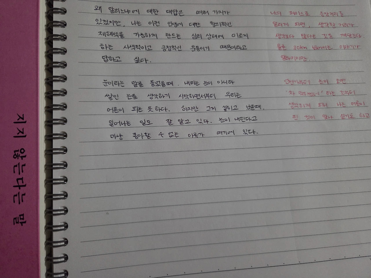 매일 하지 않지만 적어도 1주일에 2~3번 출근 전 새벽에 일어나 달리기를 한다. 달리기를 하는 이유는 몸과 마음이 건강해지고 생각이 맑아질 뿐 아니라 희한하게도 달리는 동안 글감이나 평소에는 생각지 못한 번뜩이는 아이디어가 용솟음치는 것을 느끼기 때문이다. 마치 운동화가 발을 구를 때마다 뇌에 아이디어를 꾹꾹 눌러 담아 보내는 듯한 기분이랄까. 그러다 문득 아마도 달리기 전에 잠을 깨기 위해 '필사'를 했던 과정이 영향을 준 것이 아닐까라는 생각이 들었다. 지난 상반기에는 달리기 전 김연수 작가의 '지지 않는다는 말'을, 하반기에는 정지우 작가의 '사람을 남기는 사람'을 필사하며 필사의 매력에 차분히 스며들었던 그때 말이다.