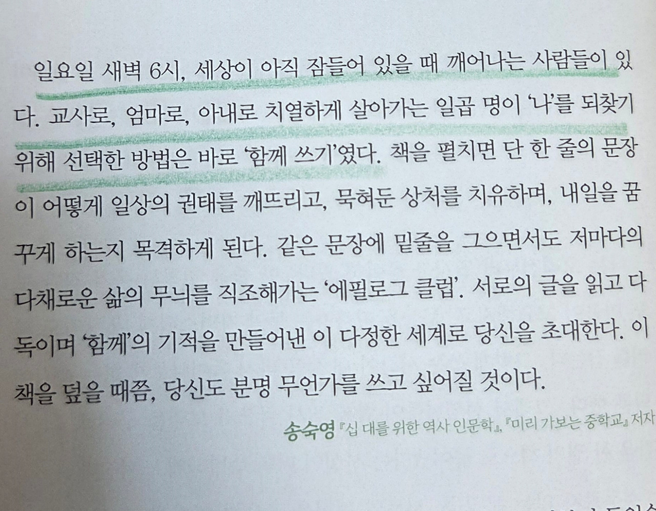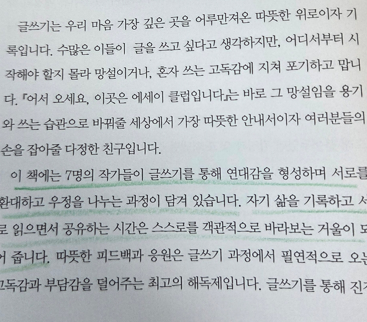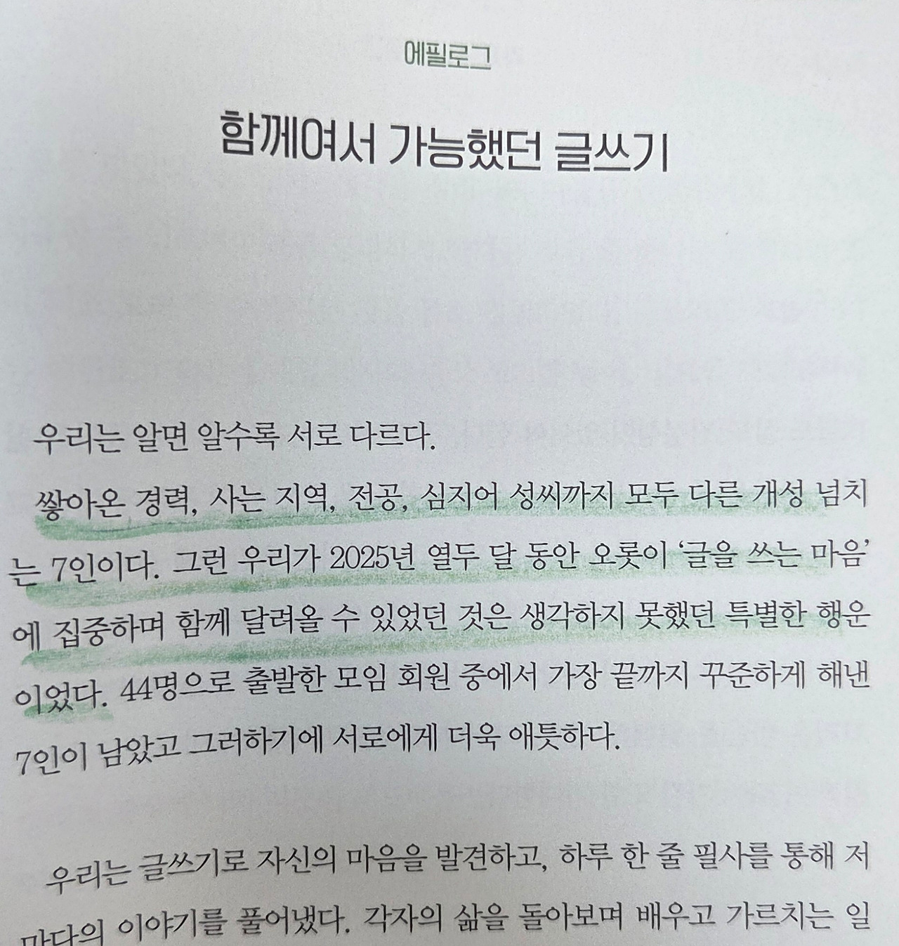 글쓰기 정말 힘들다. 그렇지만 글쓰기가 재미있고 어느 순간 글이 내 뜻대로 좀 잘 써지는 날은 묘한 성취감이 있다. 달리기를 하는 이유와도 비슷하다. 달리기를 하는 이유는 다른 데 있지 않다. 그저 달리지 않았을 때 보다 달렸을 때가 더 기분이 좋기 때문이다. 7명의 에세이스트가 매주 토요일 잠자리에 들기 전 내일을 기대하는 마음가짐과 설렘도 이와 비슷했을까. 이들이 누구도 강요하지도 않은 고난의 길을 기꺼이 갈 수 있었던 이유는 결국 '함께' 했기 때문이다. 타이트하게 이루어졌던 출간 작업들도, 책을 홍보하는 일도, 한 분이라도 더 정성 들여 추천사에 모시려는 노력들이 결코 외롭지 않았던 것은 믿음이란 가치를 서로의 가슴속에 아로새겼기 때문이 아니었을까.