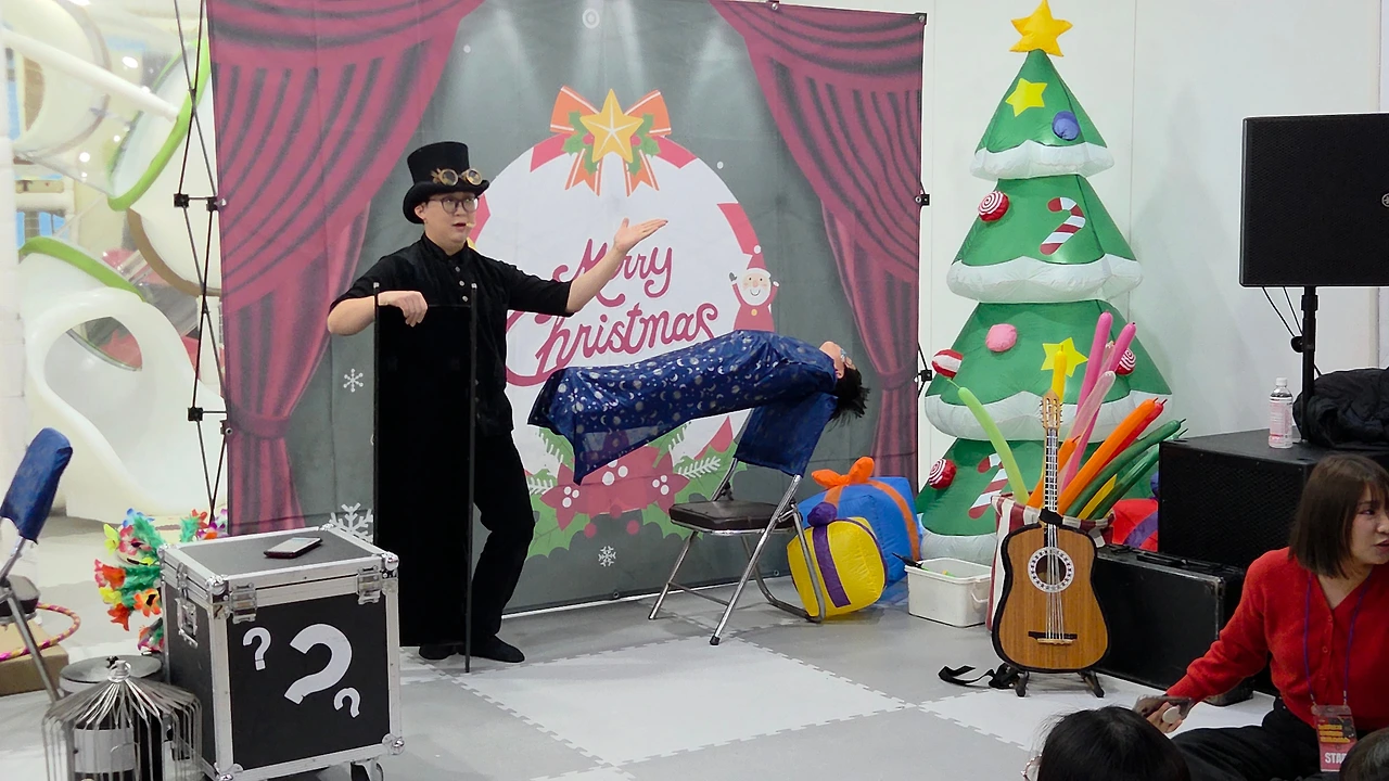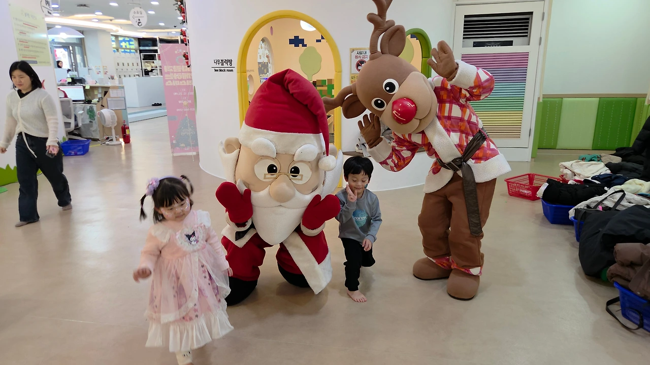 그렇게 새벽에 산타할아버지를 만나고 그날 오후, 우리 남매는 또 산타클로스와 루돌프를 만나 사진을 찍었습니다. 시에서 운영하는 놀이시설이라 그런지 직원분들도 친절하고, 큰 기대하지 않았던 마술과 페이스페인팅의 퀄리티가 수만 원을 들여 갔던 곳들보다 훨씬 좋았던 것을 느꼈습니다. 대한민국 모든 공무원분들 파이팅입니다. 아마 지레짐작건대 직원분들 이 날 다 나오셨던 거 같더군요. 또한 저희 첫째는 마술 도우미를 자처해 공중 부양 마술도 멋들어지게 성공해 내고 뿌듯해했습니다.