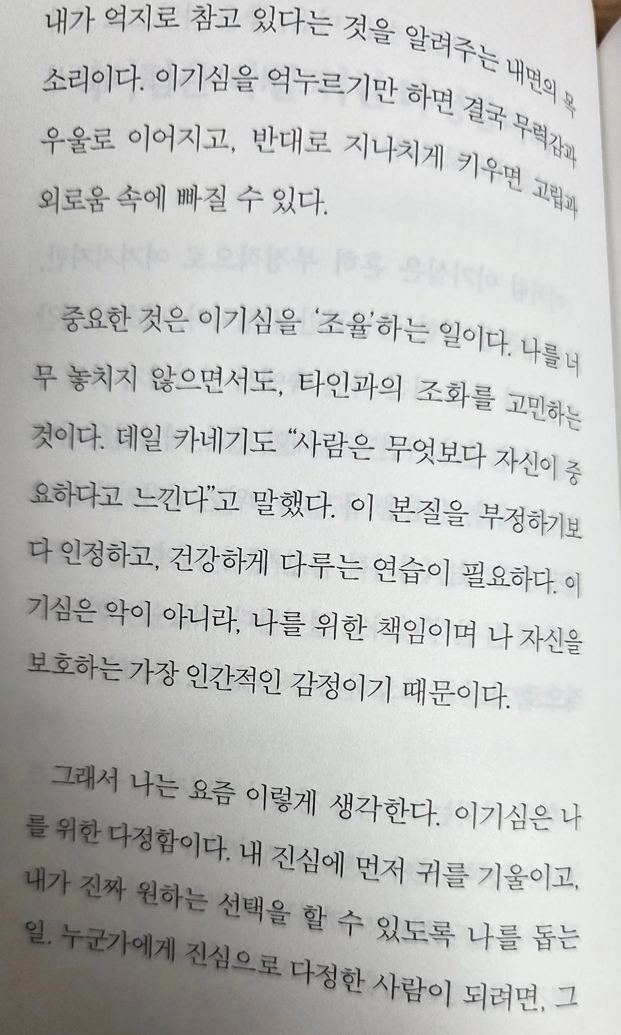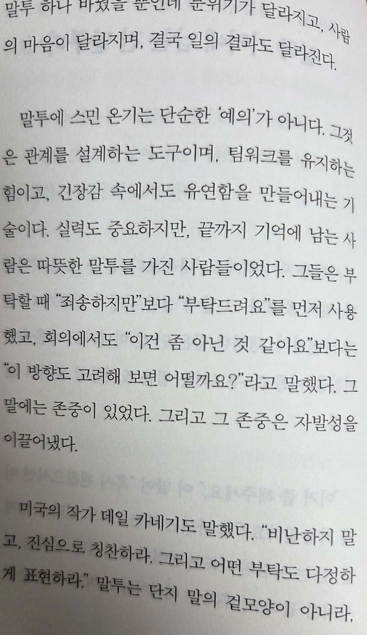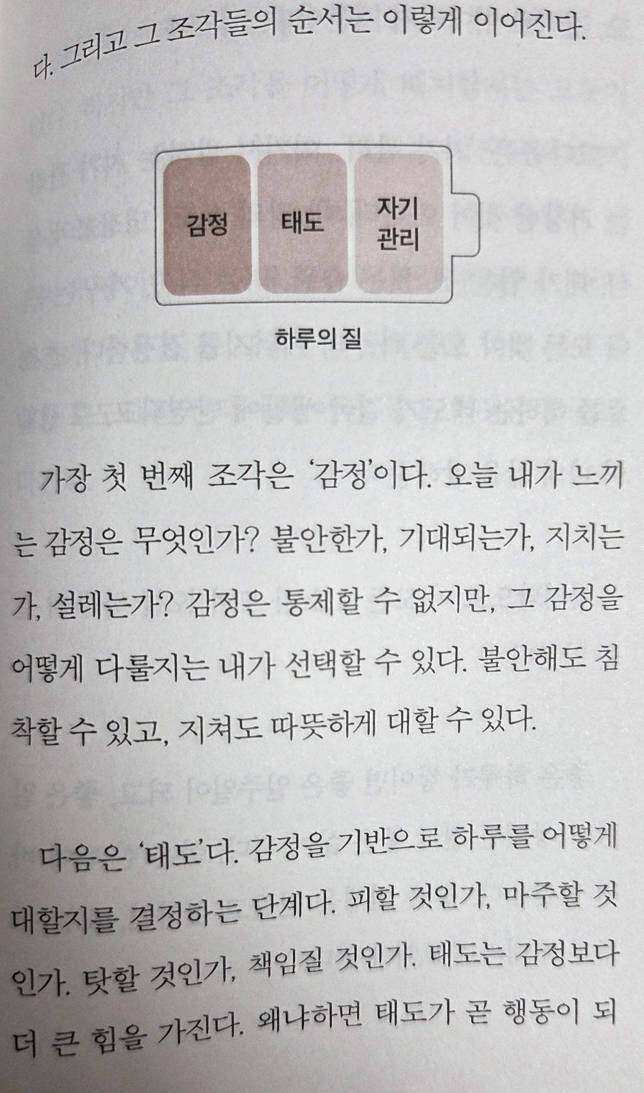 이해인 작가는 이와는 달리 다소 요란스러운 유년기를 보냈다. 부모님 밑에서 온전히 자란 것이 아니라 친척 집을 전전하며 어린 나이부터 불안함과 외로움을 묵묵히 받아들여야 했다. 순탄치 않은 가정환경이었지만 그걸 딛고 일어나 그녀는 남들에 비해 비교적 젊은 나이 때부터 회사의 리더가 되었다. 회사를 책임져야 한다는 사명감과 타고난 리더십을 바탕으로 여러 가지 고난을 거쳐온 그녀가 내린 결론은 결국 사람을 남기는 것은 말이요 관계를 조정하는 것은 태도라는 것. 그리고 그러한 말과 태도에 다정함이 묻어있는 자가 나를 오롯이 다스릴 수 있고 그를 바탕으로 남들과 더 현명한 연결고리를 조성할 수 있다는 것이다.