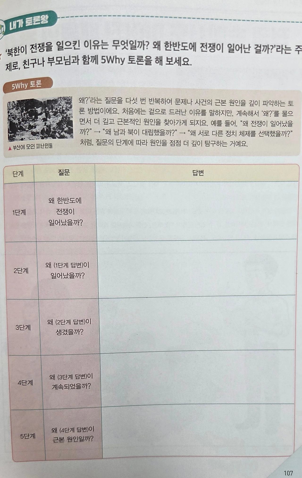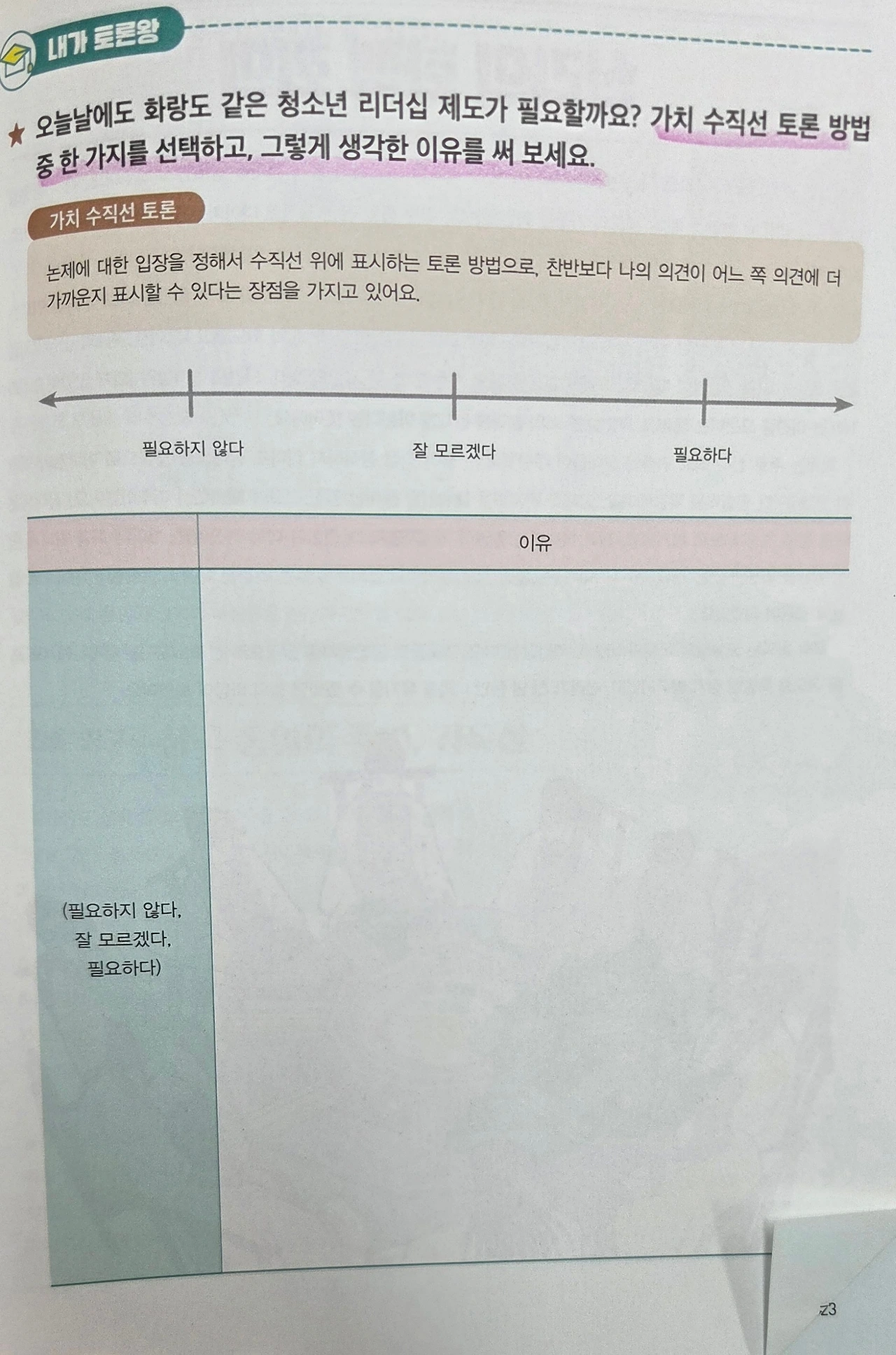 학생들의 토론 능력을 향상하는 방법은 관련된 교육학적 이론과 모형을 분석해 독자의 눈높이와 흥미도를 고려하여 알맞게 재구성하여 투입하는 것이다. 『열려라 역사 논술』에는 '내가 토론왕'이라는 부분에서 이를 효과적으로 구현하고 있다. 학부 시절 수업시간에 배웠던 교육학 이론과 임용고시 준비를 하며 마주했던 '5 Why 토론', '가치 수직선 토론' 등은 지루하고 어렵게 느껴졌었다. 그런데 이렇게 이해하기 쉽게 도식화되고 예시 질문까지 친절하게 제공되어 있으니 절로 역사적 사건에 대한 나의 생각을 정리하고 싶은 생각이 들었다.