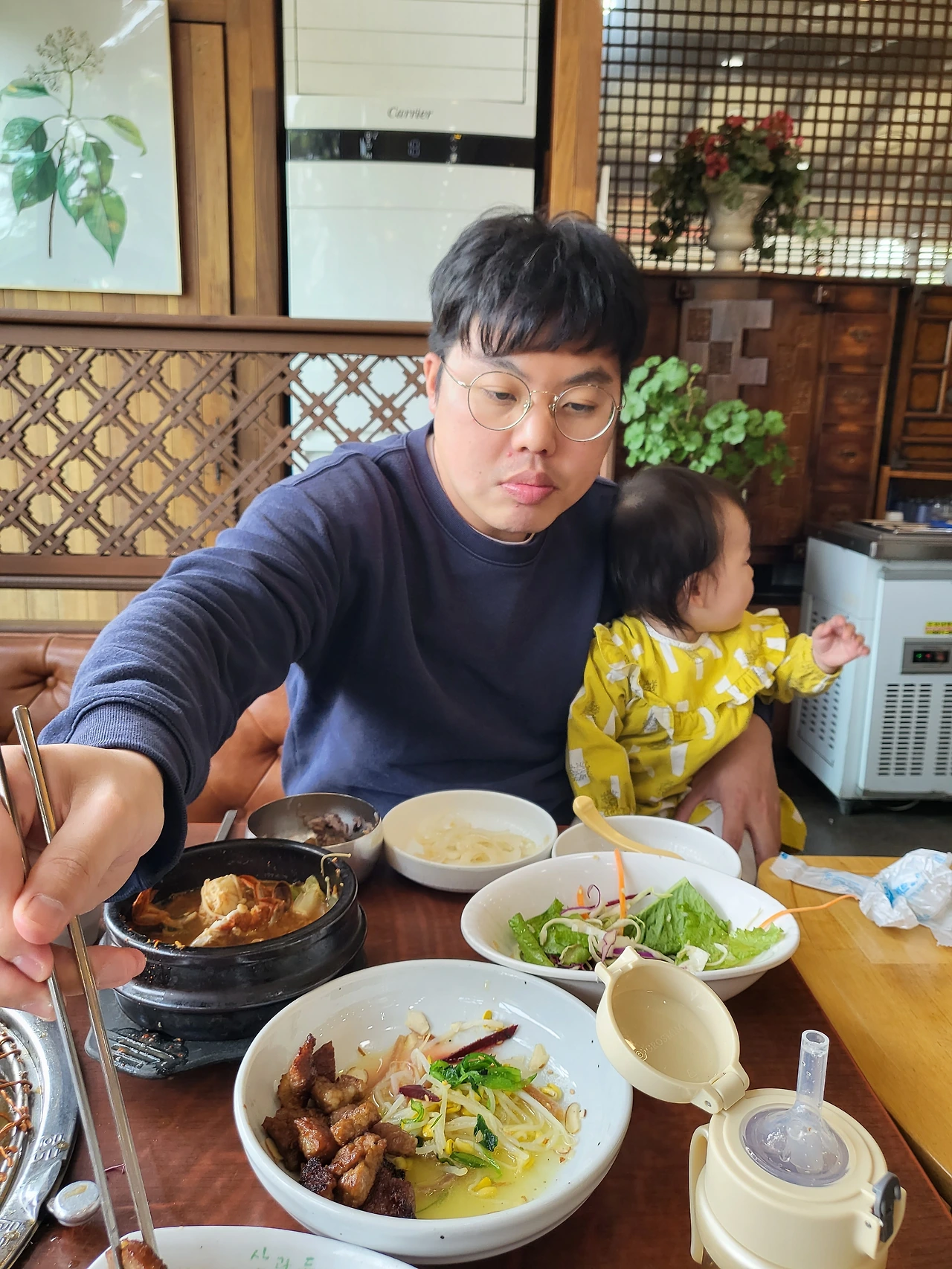 얼마 전부터는 소위 '가든'이라고 불리는 고깃집에서 돼지갈비를 먹는 것을 시도하고 있고 아이들의 반응도 꽤 좋아 자주 이용할 생각이다. 36개월이 다 되어가는 첫째는 일반 의자에 앉아 개인 접시와 식기를 갖고 혼자 식사가 가능하다. 16개월인 둘째는 아직도 내가 품에 끼우고 식사를 하는 편인데, 그래도 전에 비해서 서서 먹는 빈도가 조금 줄었다. 계절이 몇 번 더 바뀌면 내 몸이 좀 더 홀가분해질 것 같은 느낌이다.