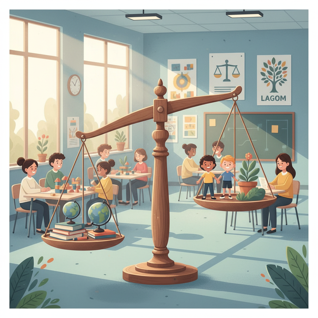 라곰(Lagom)이란 '너무 많지도 적지도 않은 딱 적당한 상태'로 균형과 중용을 중시하는 스웨덴식 삶의 철학입니다. 대략 10여 년 전, 휘게(hygge) 문화가 한국 문화에 소개될 즈음에 함께 발을 들인 북유럽식 문화로써, 개인의 독립성을 존중하고, 격식보다는 실질적인 평등을 강조하며, 구성원 모두의 의견 합의를 존중하는 특징이 있습니다. 동양에서의 '중용'과 그 의미가 비슷하지만 라곰은 개인 만족과 공동체의 지속 가능성을 함께 고려한 균형의 미학으로 설명되는 반면 중용은 상황에 맞는 ‘적정한 선택’에 초점을 둔다는 데에서 다소 차이가 있습니다. 이러한 라곰의 문화가 오늘날의 교육 현장에서 시사하는 바가 있다면 어떤 점에 초점을 맞추면 좋을까요?