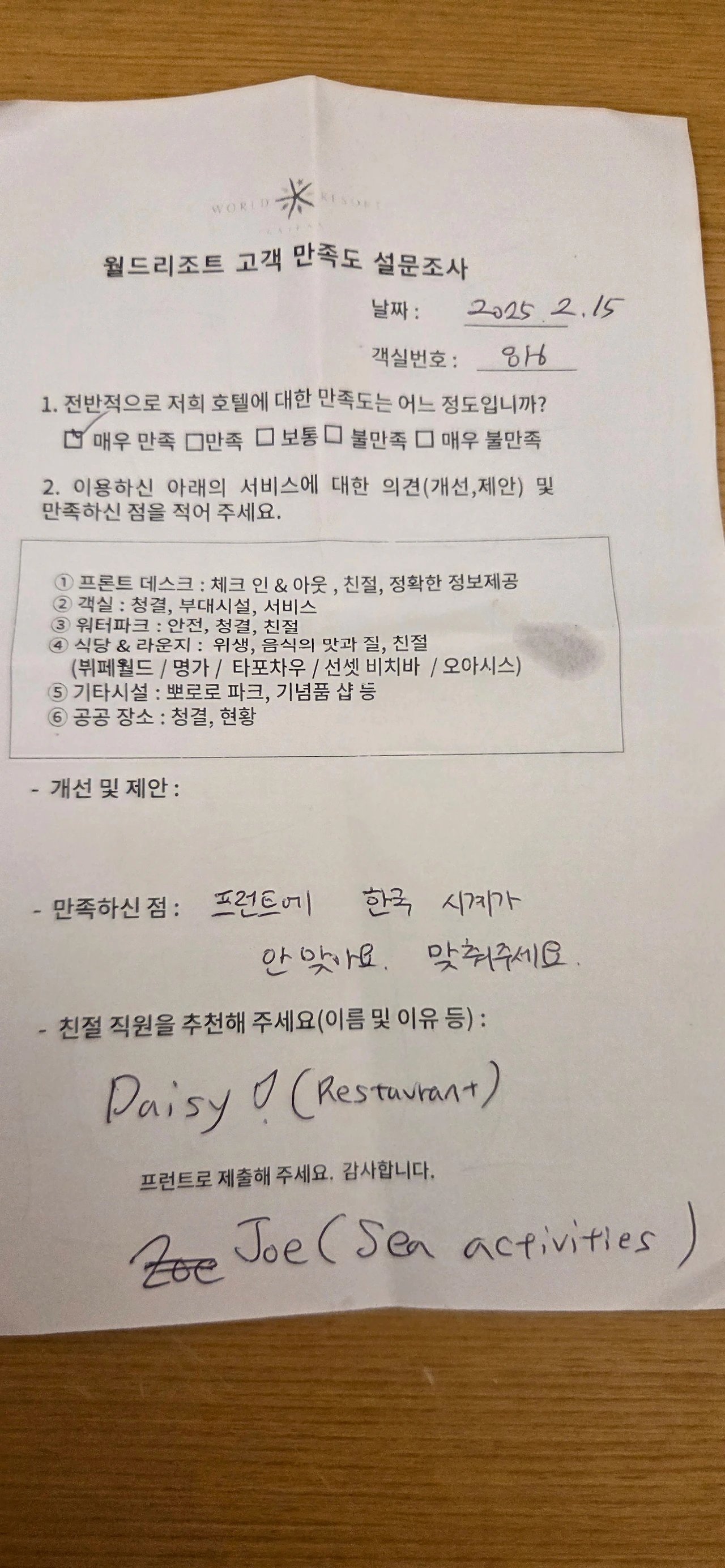 그리고 체크아웃하는 날 고객 만족도 설문조사에서 호텔 들어가는 날부터 눈에 들어왔던 것을 적었습니다.
