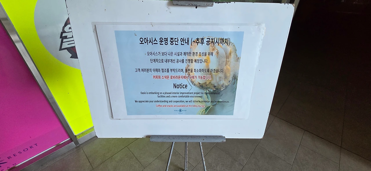 실은 월드리조트 내에도 도서관이 존재했었습니다. '오아시스'라는 이름의 카페형 독서 공간인데요. 오아시스를 드나드는 출입문이 열려 있어 안을 살펴보니 우리나라의 여느 카페와 비교해도 인프라가 뒤처지지 않을 정도로 훌륭한 입지를 갖추고 있었습니다. 연령대 별로 추천 도서가 가지런히 정리되어 있었고 책을 읽기 알맞게 책상과 의자도 안락하게 배치가 되어있었죠. 카페 구석진 곳에는 보드게임을 대여해서 가지고 놀 수 있는 공간도 있었으며 찾아보니 과거에는 생일 축하에도 제격인 홀케이크를 수제로 제작해서 판매했었다고 하는군요. 불과 2023,4년까지만 해도 운영을 했다가 종료된 것을 보니 사업적인 측면에서 이문이 많이 남지 않았던 듯합니다. 추후에는 제대로 운영이 잘 되었으면 하는 바람이네요.