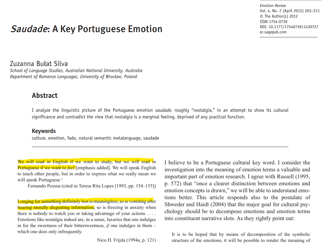 포르투갈의 대문호인 페르난두 페소아(Fernando Pessoa)는 "사우다드는 타인을 향한 것이 아니라, 우리 자신 안에 존재하는 결핍에 대한 기억이다."라고 합니다. 또한 마누엘 드 멜루(Manuel de Melo)는 "사우다드란 우리가 즐기는 고통인 동시에 우리가 사랑하는 불행"이라고 정의합니다. 이처럼 포르투갈을 대표하는 독특한 정서이자 단순한 활자를 통해 정의할 수 없는 단어가 있으니 그것은 바로 '사우다드'(Saudade)입니다.