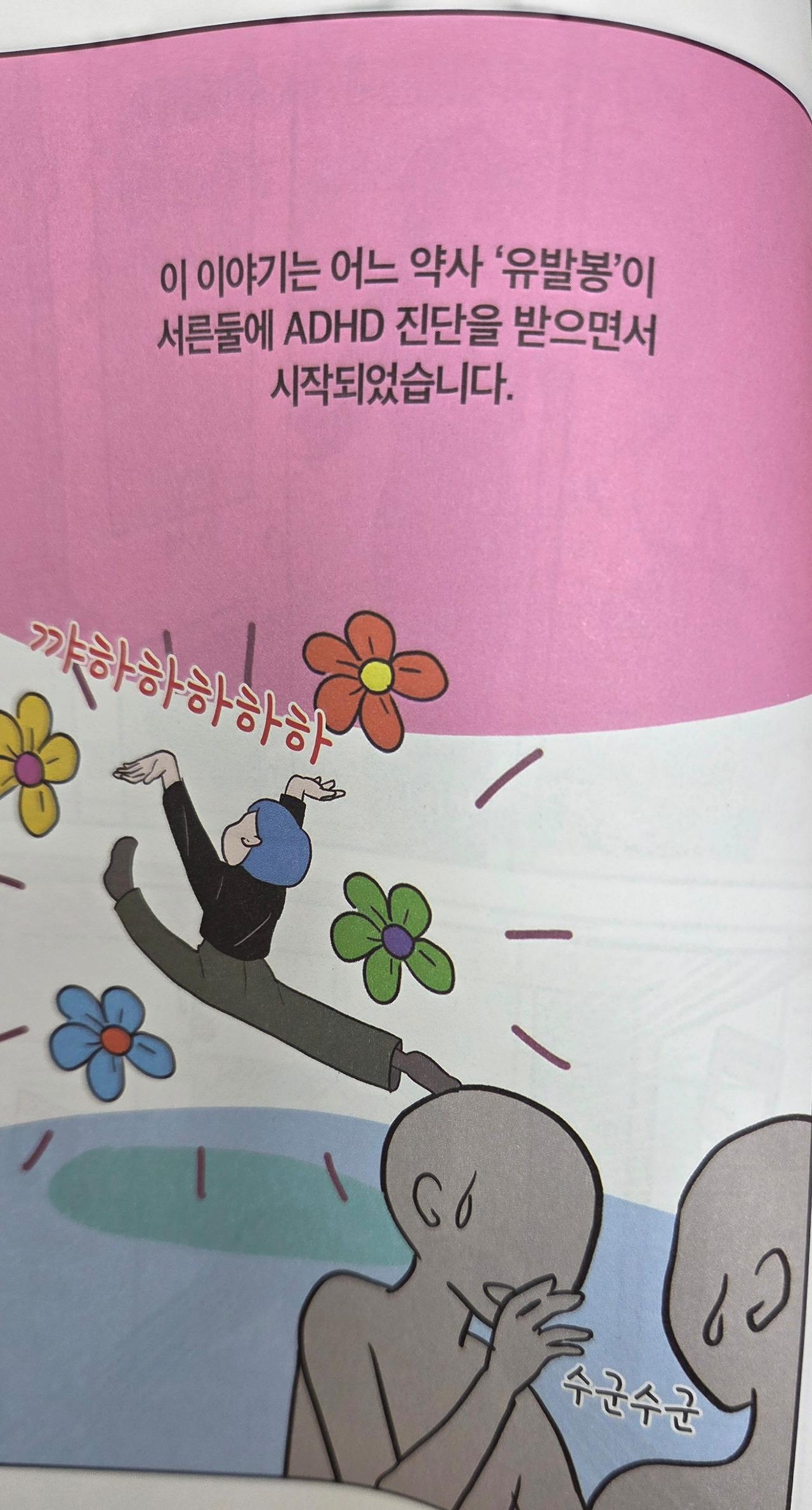 『이 땅에 ADHD로 태어나』는 서른두 살에 성인 ADHD진단을 받은 작가가 ADHD로 살아온 자신의 이야기를 담아 '나는 도대체 왜 그럴까?'라는 질문에 대한 해답을 웹툰으로 담아낸 여정의 기록이다. ADHD 당사자나 그 주변 사람들의 오해와 편견을 해소하고 있는 그대로의 모습을 존중하기를 바라는 작가의 마음이 가닿았는지 이 시리즈는 장장 9개월간 연재되어 사람들의 많은 호응을 얻었다. 인상 깊었던 장면은 툭하면 "나 ADHD인가 봐"라며 자조 섞인 말을 하는 이들에게 ADHD가 어떤 특징이 있는지 정확한 정보를 토대로 일침을 가하는 것이었다. 그리고 그 핵심은 '집중력'이고 ADHD는 집중력이 떨어지는 병이 아니라 집중력을 조절하지 못하는 병이라는 것이었다. 이 책은 ADHD 병뿐만 아니라 하나의 밈으로 조롱받는 사회적 인식을 개선하고자 노력의 산물이다. ADHD로 고통받는 당사자들의 아픔을 누구보다 잘 알기에 그것이 나로 인해 옅어질 수 있기를 바라며.