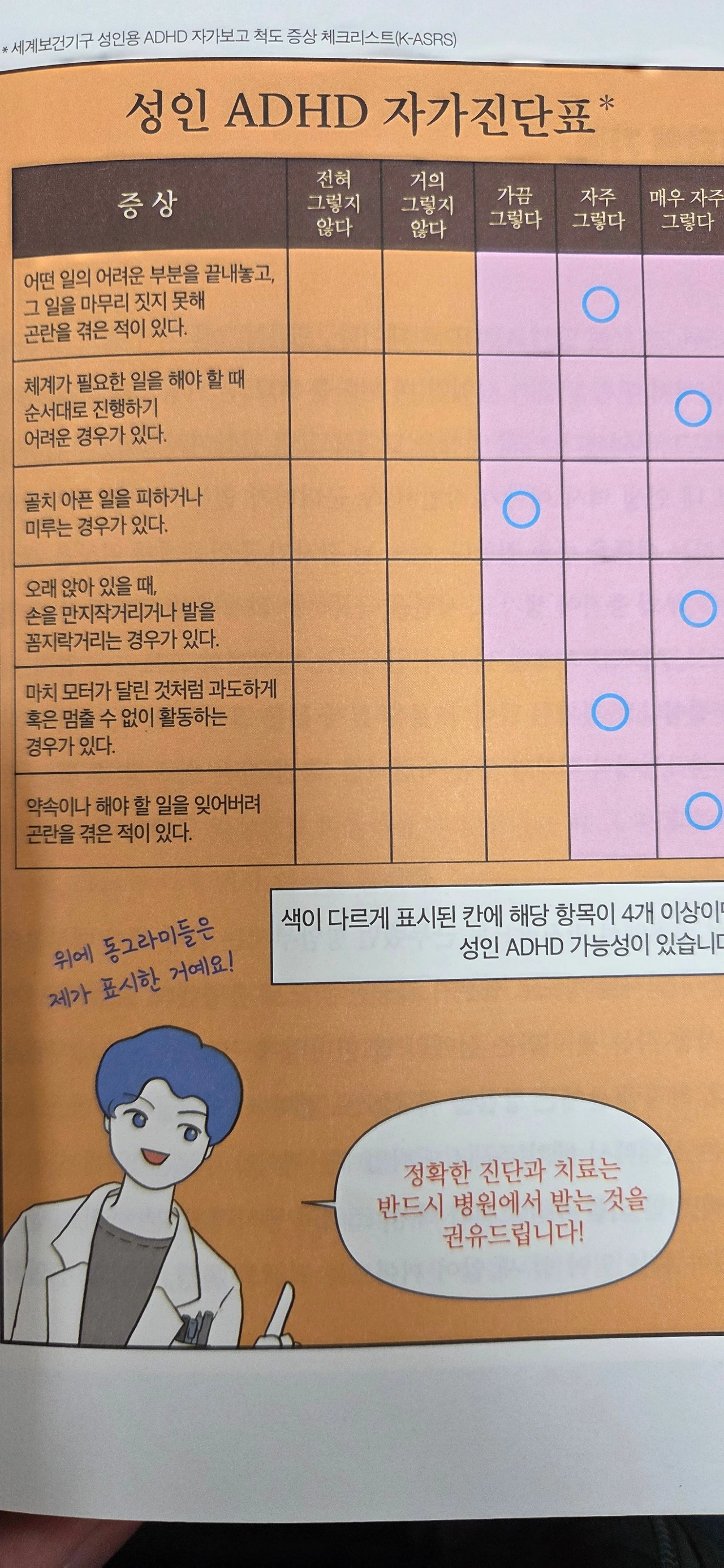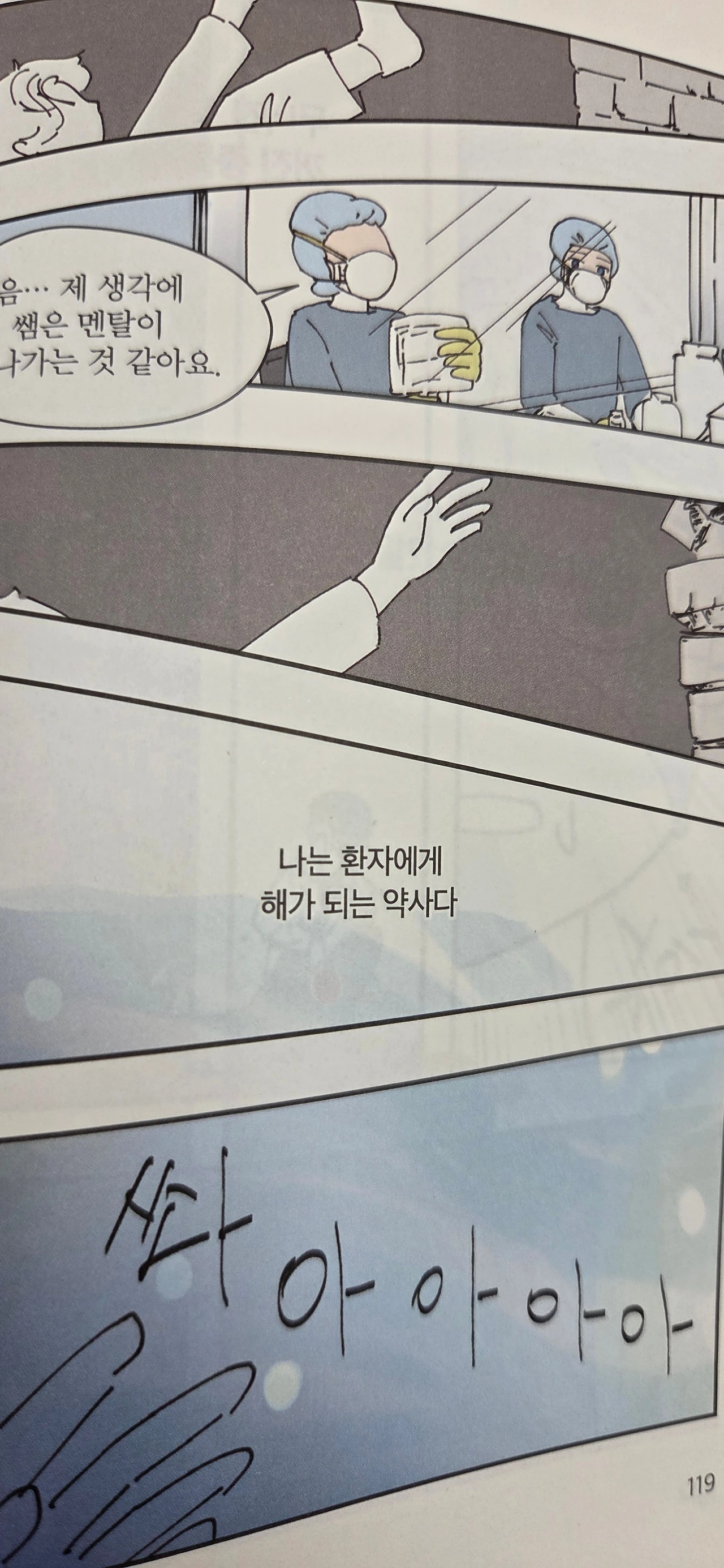 작가는 병원약사로 일하면서 자신에게 무슨 문제가 있다는 것을 심각하게 인지했다. 그냥 조금 남들과 성향이 다르다고 인식해 왔던 삶이 누군가를 해할 수 있는 상황을 야기했기 때문이다. 특히 항암치료제를 조제하는 과정에서 이 생각은 극에 달했다. 생명을 다루는 절체절명의 상황, 자잘한 실수조차 용납되지 않는 그곳에서 그녀는 퇴사를 결심하고 정신과 치료를 다짐한다. 다행히도 이런 그녀의 모습을 편견 없이 받아주고 지지하며 응원해 주는 사람이 있었기에 그녀는 있는 힘을 다해 뇌에 힘을 쏟아부어 말과 행동에서 실수들을 줄여나갔다. 그 덕에 그녀도 그녀와 비슷한 처지에서 고군분투하는 이들을 어루만져주는 멋진 웹툰을 그려낼 수 있지 않았을까.