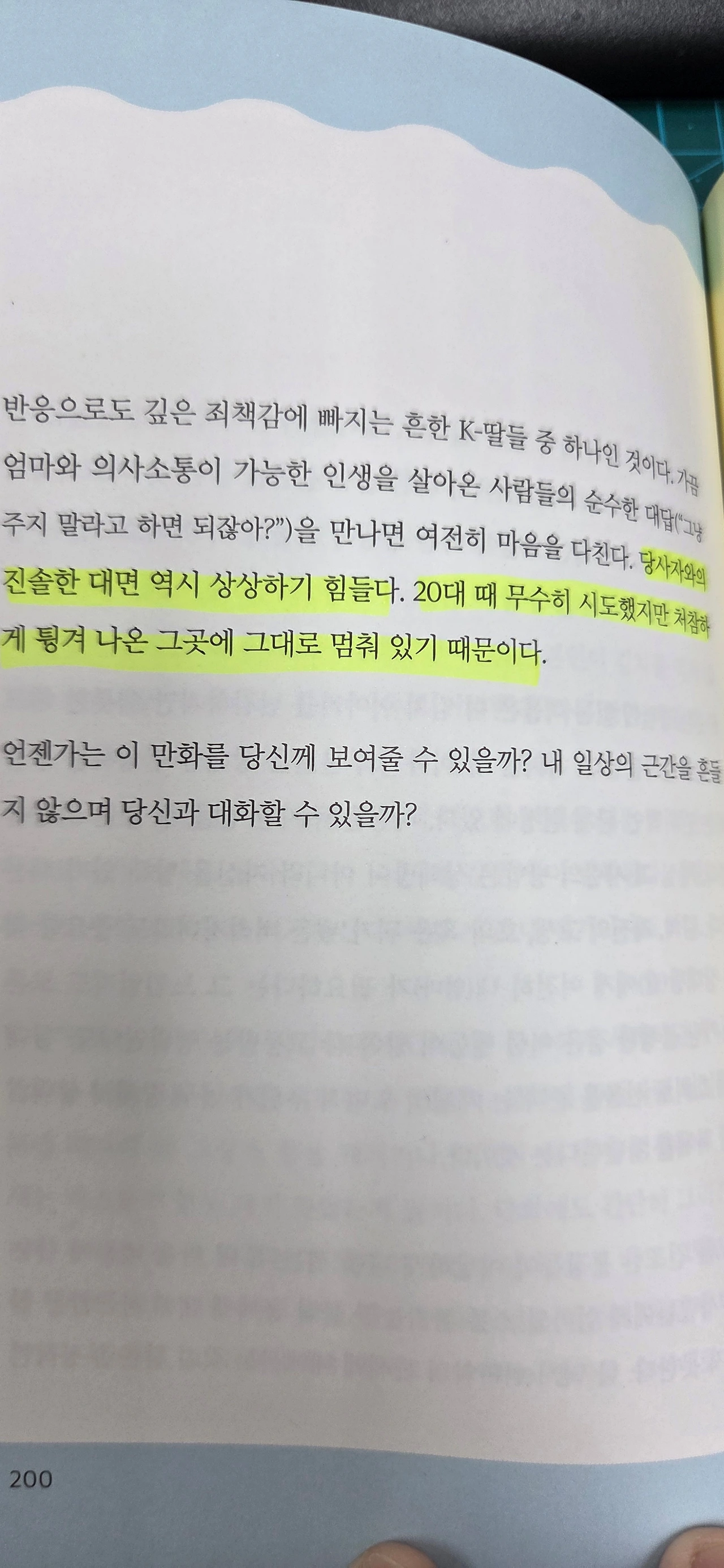 그렇게 자기 자신이 ADHD라는 것을 인정한 후로 작가는 그녀의 엄마, 외할머니, 그리고 그녀의 딸의 말과 행동에서 투영된 묘한 동질감에 대해 좀 더 선명하게 이해하기 시작했다. 그리고 그녀는 깨달았다. ADHD는 전 생애를 통해 우리 삶에 찾아올 수 있다고. 엄마의 자식 사랑과 내가 엄마에게 바라는 것이 숱하게 평행선을 달려왔던 것도, 이 글을 과연 엄마에게 자신 있게 선사할 수 있을까라며 망설이게 되는 것도 다 그런 이유에서였다는 것을 말이다. 그녀가 결국 용기를 내어 수많은 사람들이 혼자 끙끙 앓고 있던 것을 보듬어주었듯이 지금도 학교 어딘가에서 애쓰고 있을 어린 발봉이들을 위해 나도 관심을 좀 더 갖고 살아야겠다는 생각을 해 본다. 너의 삶에 짐이 되지 않게. 작은 힘이 될 수 있게.