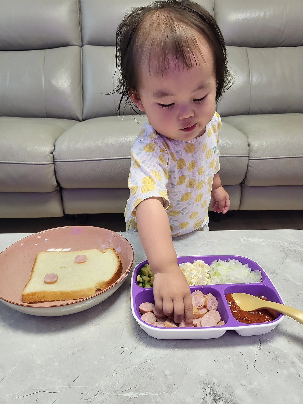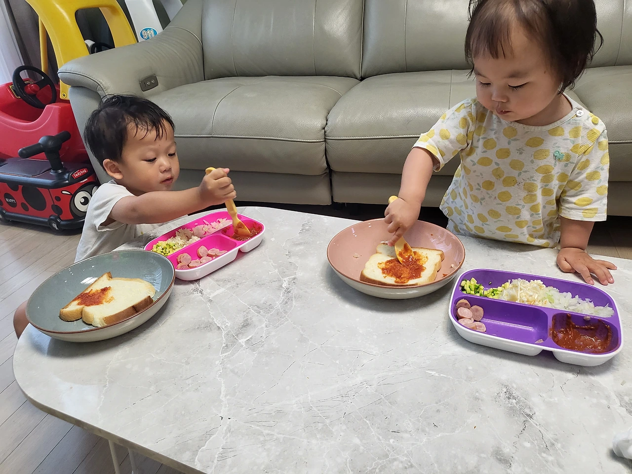 퇴근하고 집에 돌아오는 데, 카톡이 울린다. 와이프가 보낸 메시지다. 열어보니 사진 파일이 연거푸 5~6개씩 날아온다. 우리 아기들 모습이긴 한데 가만 보니 무언가를 열심히 하고 있다. 유아용 식기도구가 보이길래 이른 저녁을 먹고 있나 보다 했다. 그런데 자세히 보니 먹는 게 아니라 뭔가를 만들고 있는 것 같았다. 알고 보니 식빵으로 피자를 만들고 있는 것이었다.