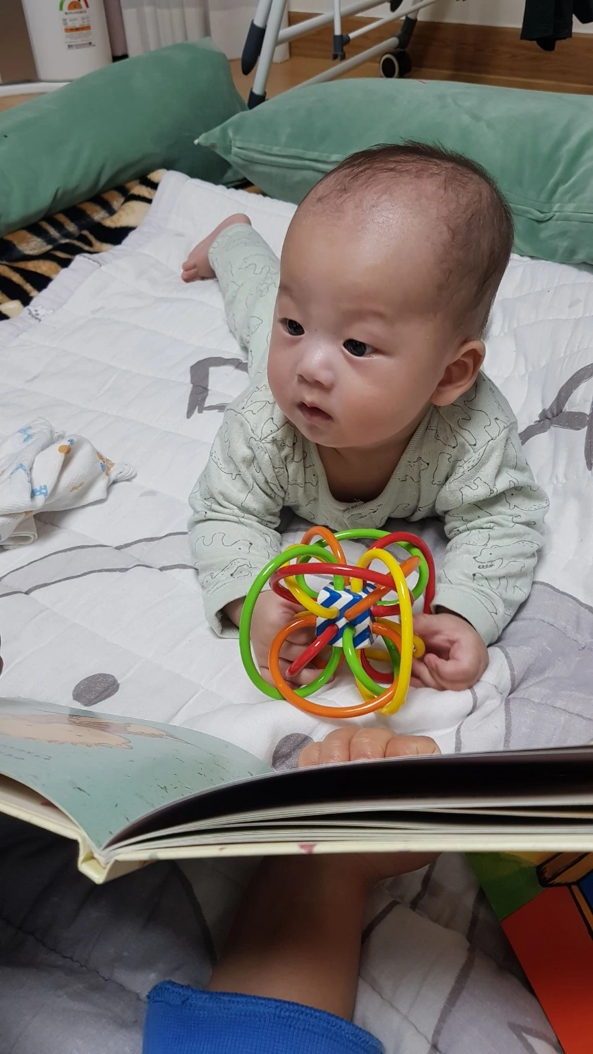 동화책을 읽어주는 아빠의 모습에 집중하는 모양새가 재미있다. 와이프가 읽어주래서 읽어는 주는데 이게 과연 의미가 있나 솟구치는 의구심을 눌러 담은 채 열심히 읽어준다. 그 사이 와이프가 퇴근하는 소리가 들린다. 천군만마를 얻은 느낌이다. 오늘 푹 자고 일어난 와이프가 들뜬 목소리로 오자마자 이렇게 말한다.