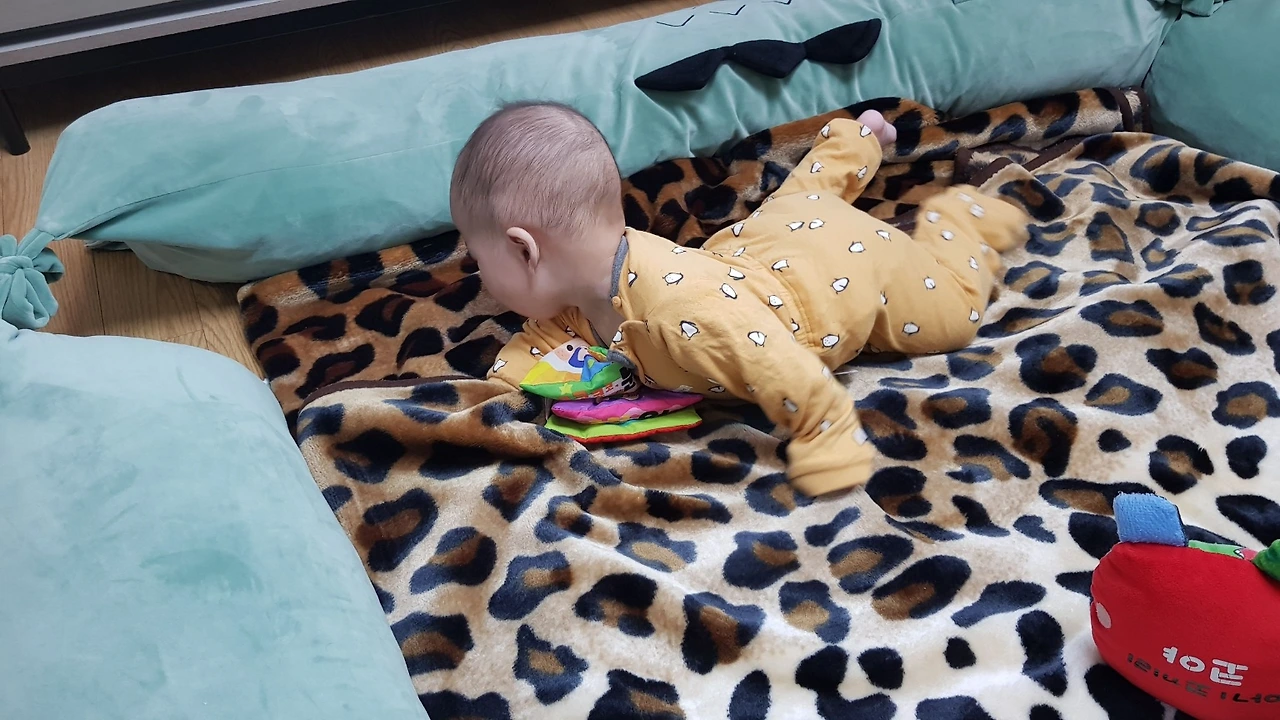 세탁기 빨래가 돌아가는 동안 대변을 보아서 배고플 수 있으니 쌀미음을 먹여보도록 한다. 처음보는 실리콘 스푼이 신기하고 처음 접하는 미음의 텍스처가 생각보다 괜찮은 모양이다. 그래도 오늘은 지난번보다 3,4숟갈 더 먹는다. 이제 슬슬 찹쌀을 혼분해도 되겠다는 생각을 해본다. 한 30분 뒤면 수면 의식을 해도 되겠다 싶어 '더미타임'을 주기로 한다. 요즘 부쩍 배밀이를 좋아하는 아들을 위해 무대를 마련해 주기로 한다. 바닥에 폭신한 담요를 깔고 사방에 방지쿠션을 설치해주면 아들만의 쇼타임이 시작된다.
