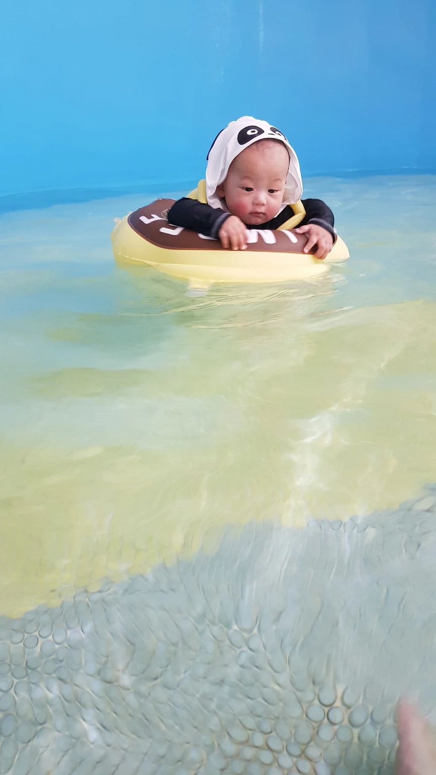 아들이 생후 7-8개월이 되던 무렵, 우리 가족은 처음으로 여행을 떠났다. 장인어른께서 제공해주신 숙박 티켓을 꼭 쥐고 강원도로 향했다. 신기한 점이 하나 있다면 식구가 한 명 늘었을 뿐인데 가져가야할 짐은 산더미라는 것이었다. 기저귀, 젖병, 젖병세척도구, 아기 욕조, 분유, 분유 포트, 유아용 세면도구, 갈아입힐 옷 , 수건, 유모차 등 일일이 세면 셀 수록 챙겨야 할 것이 계속 늘어나는 마법이 일어난 셈이다. 거기다 설렘을 가득 안고 구매한 '유아용 튜브'까지. 리조트 객실은 작고 아담했지만 주변에 이용할 수 있는 시설도 많고 주변 경관이 무엇보다 가족 단위를 대상으로 해서 그런지 아기자기하고 알록달록했다. 다른 부대시설은 아직 우리 아들이 이용하기엔 한참 모자랐기에 물놀이라는 미션에 도전해보기로 했다. 인생 첫 물놀이를 경험한 아들은 세상 신기하다는 표정을 연신 지어보이며 즐거워했다. 모든 오감을 총동원하여 물속에서의 감각은 어떤 것인지 탐색하려고 노력하는 모습이 너무 재미있고 신선했다.
